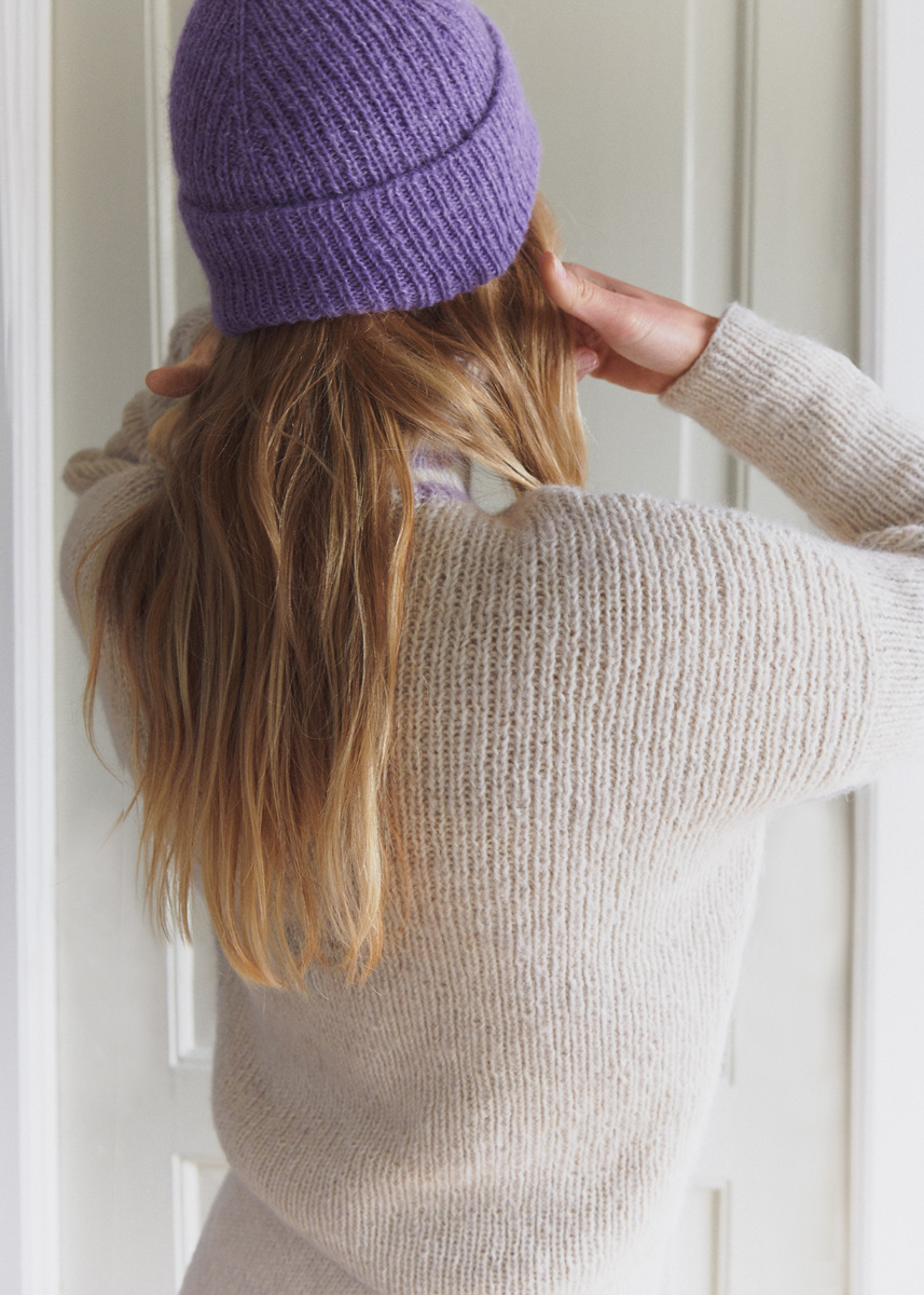 Lana Grossa-Qualität „Natural Alpaca Pelo“ (63 % Baumwolle, 31 % Alpaka (Baby), 6 % Schurwolle (Merino); Lauflänge = 125 m/50 g): 600 (700/800/900) g Muschel meliert (Fb 22); und 100g Rohweiß/Flieder (Fb 202); je eine 40 cm und eine 80/100 cm lange Rundstricknadel 3 mm und 3,5 mm; Maschenmarkierer.