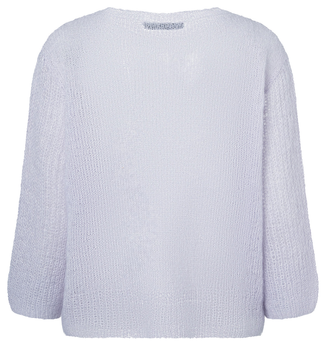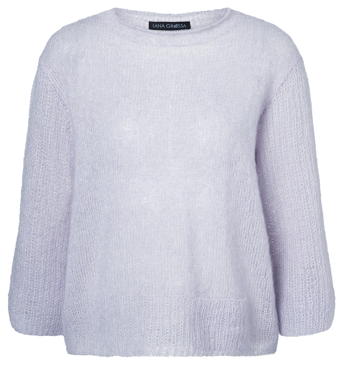 Lana Grossa Silkhair (70% Mohair, 30% Seide, Lauflänge 210 m/25 g), 125 (150 – 175 – 200) g Graulila (Fb 152); Stricknadeln Nr. 3,5, 4 und 6, 1 Rundstricknadel Nr. 3,5 und 6, 40 cm lang.
