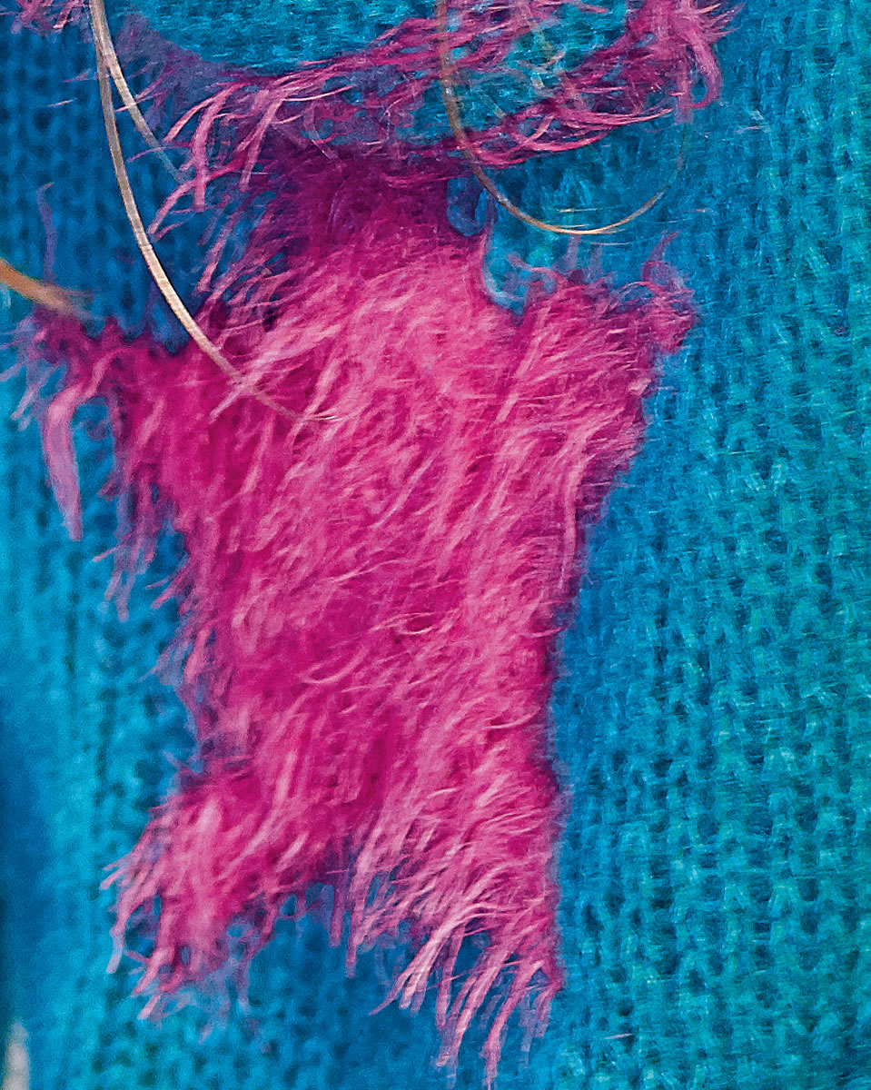 Lana Grossa Qualität „Silkhair“ (70% Mohair, 30% Seide, LL = 210 m/25 g), ca. 125 (150) g Türkisgrün (Fb 22) und Lana Grossa Qualität „Peppina“ (60% Polyamid, 25% Schurwolle Merino, 15% Polyacryl, LL = 85 m/50 g), ca. 50 g Zyklam (Fb 5), Stricknadeln Nr. 7 und 1 Häkelnadel Nr. 7.