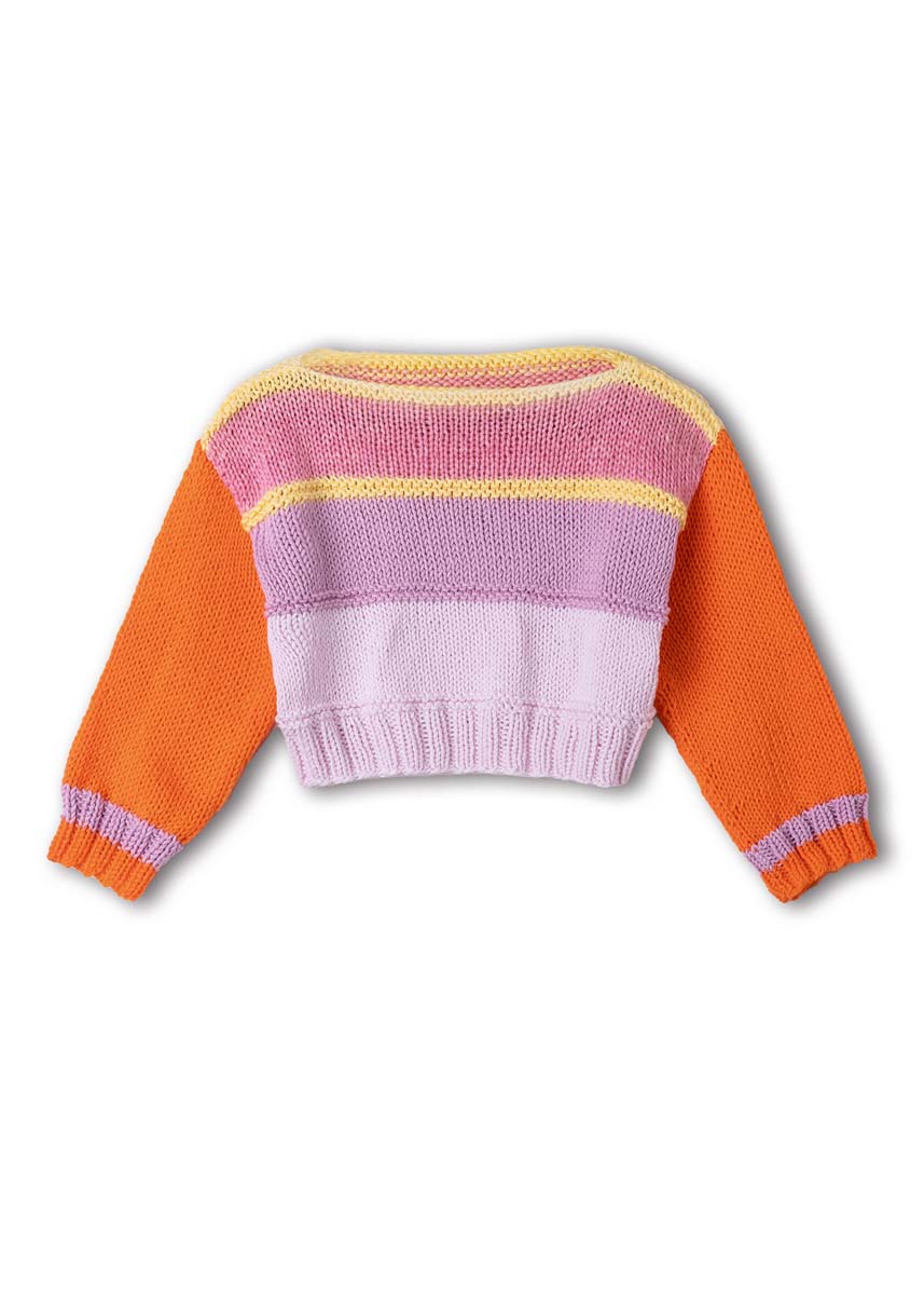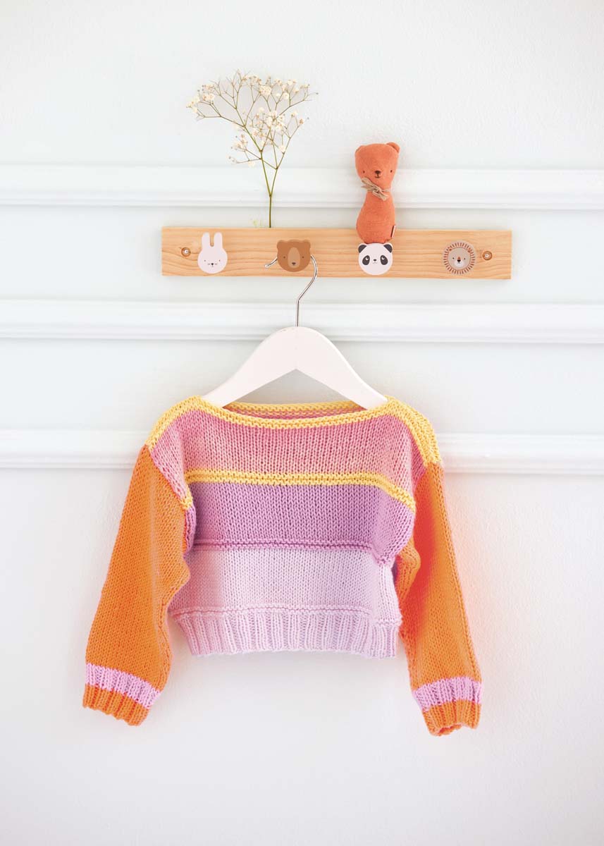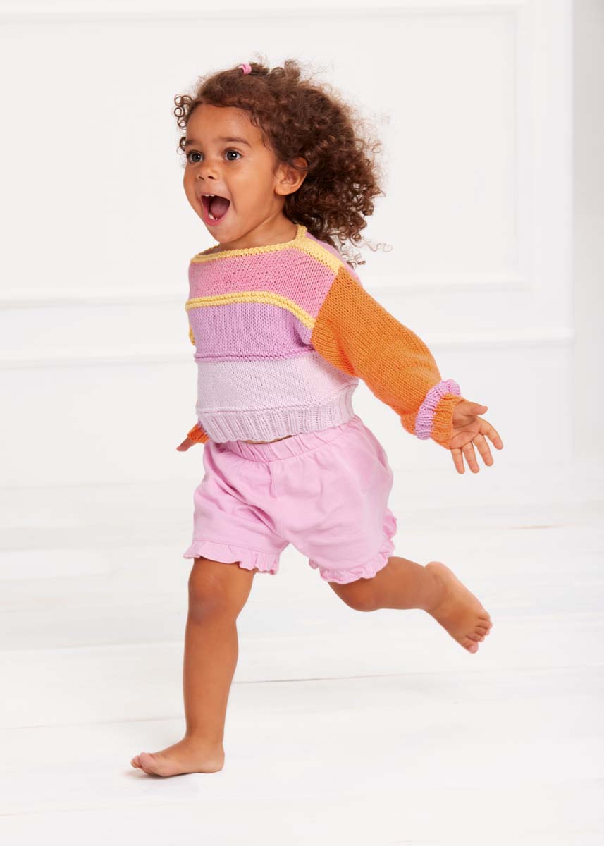 Lana Grossa Soft Cotton (70% Baumwolle, 30% Polyacryl; LL = 140 m/50 g): je 50 (50/50/100) g Zartrosa (Fb. 7) und Orange (Fb. 59) und je 50 g Flieder (Fb. 22), Apricot (Fb. 1) und Gelb (Fb. 11); je eine Rundstricknadel 4 mm und 4,5 mm.
