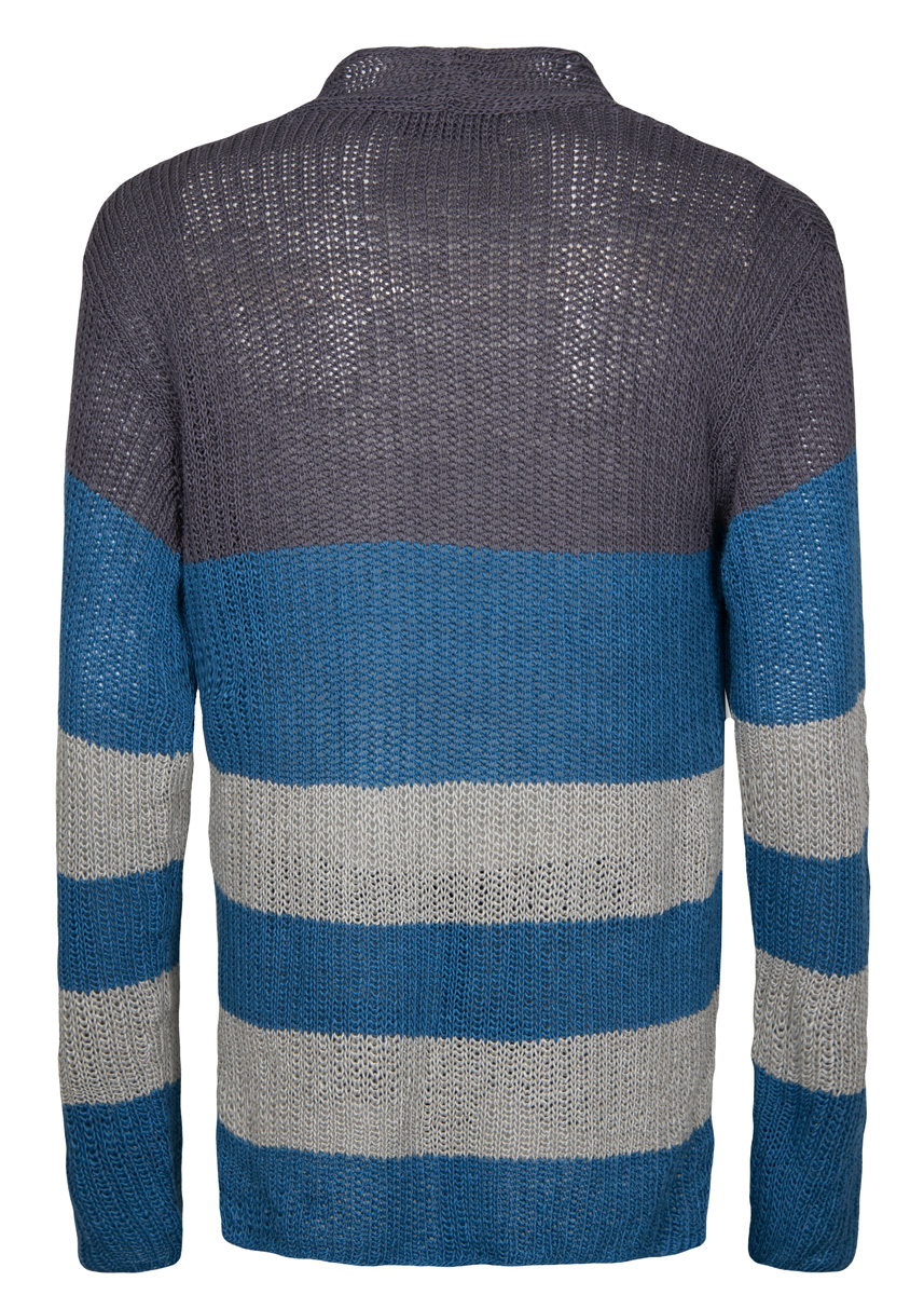 Lana Grossa Solo Lino (80% recyceltes Leinen (Viskose), 20% Leinen, Lauflänge 120 m/50 g), 350 (400 – 450) g Saphirblau (Fb 30), 200 (250 – 250) g Grüngrau (Fb 5) und 200 (250 – 250) g Dunkelgrau (Fb 31); Stricknadeln Nr. 3,5.