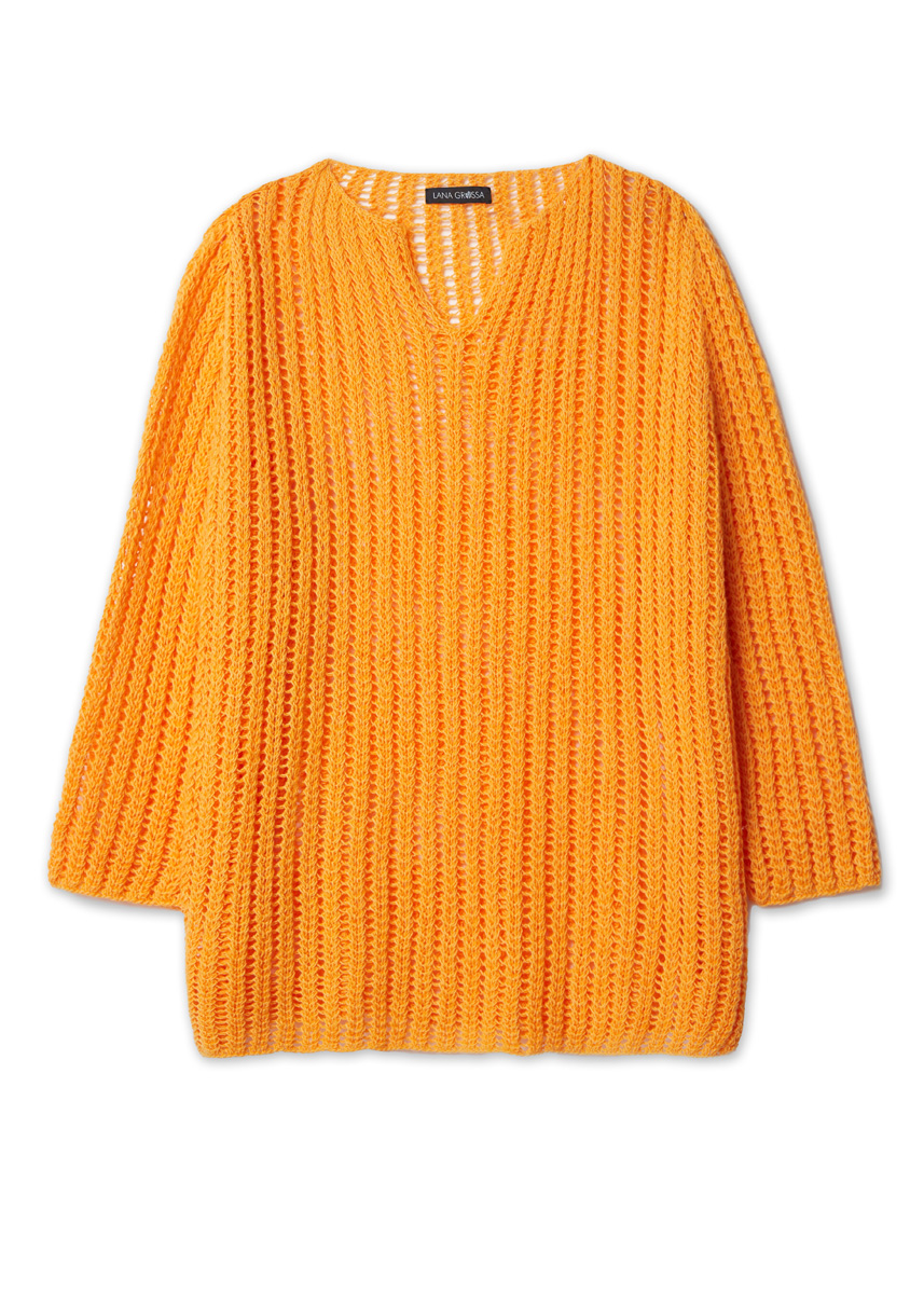 Lana Grossa Sottile (85% Baumwolle, 15% Schurwolle (Merino), Lauflänge 250 m/50 g), 250 (300 – 350 – 400) g Orange (Fb. 2); Stricknadeln Nr. 4.