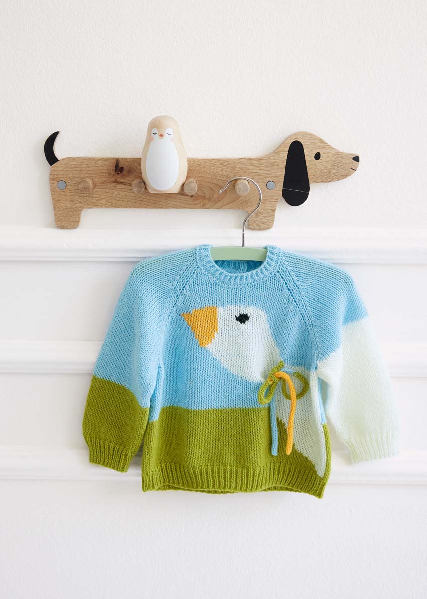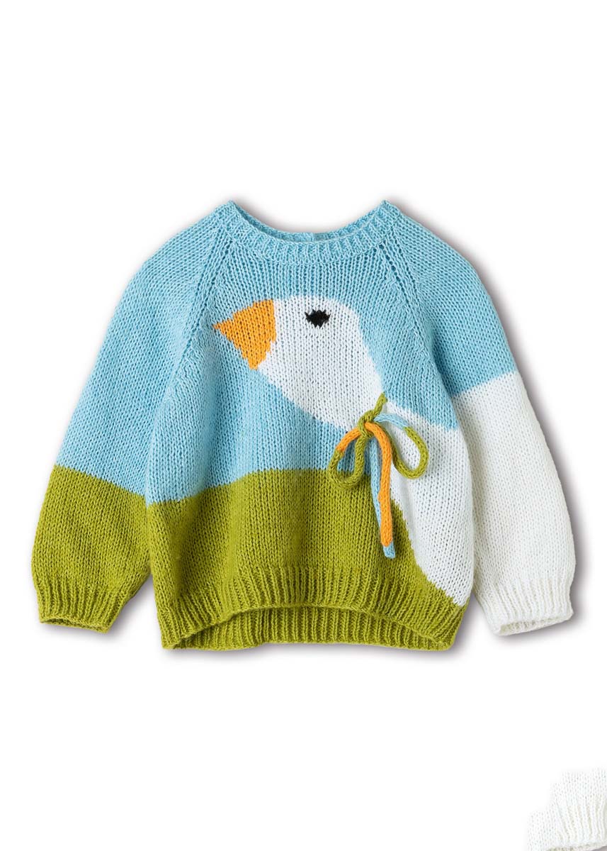 Lana Grossa Sottile (85% Baumwolle und 15% Schurwolle (Merino); LL = 250 m/50 g): 50 (50/100/100) g Hellblau (Fb. 8), je 50 g in Pistazie (Fb. 13), Orange (Fb. 2), Schwarz (Fb. 18) und Weiß (Fb. 16); je eine Rundstricknadel 3,5 mm und 4 mm; Maschenmarkierer; Strickliesel (alternativ 2 Spielnadeln 3,5 mm); Druckknöpfe aus Kunststoff mit 7 mm Ø.