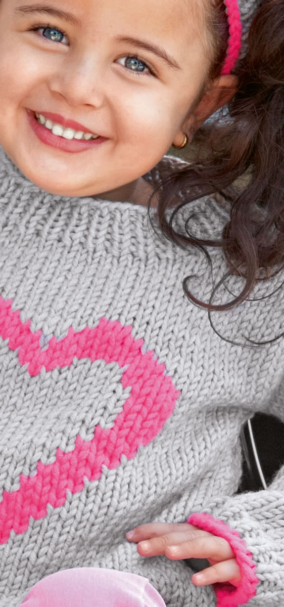 So trägt man das Herz am rechten Fleck... Damit jeder dieses Signal schon von weitem erkennt, wird es in einem Neon- pink leuchtenden Garn gestrickt. Süß dazu: das passende Stirnband.