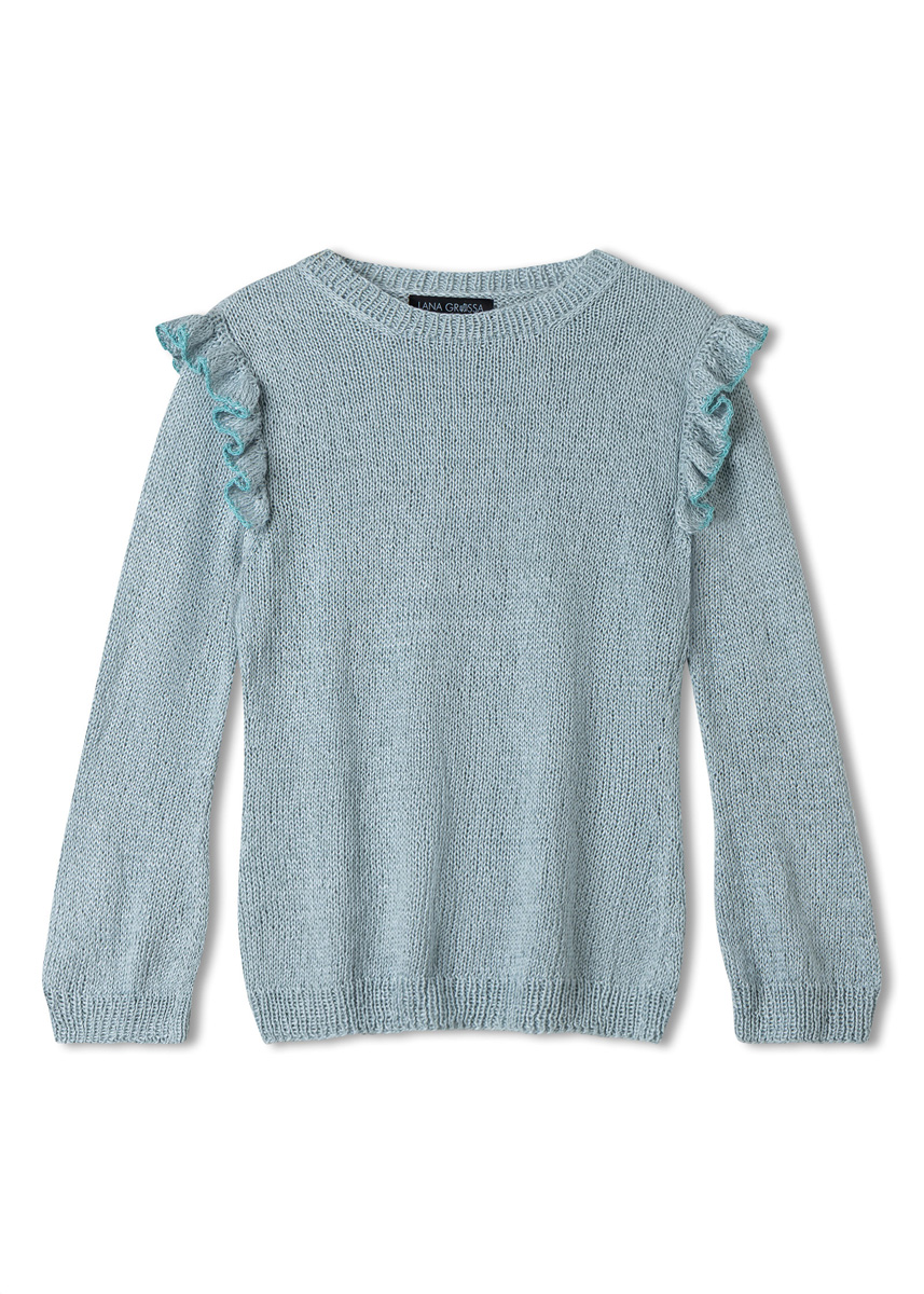 Lana Grossa Tencellino (51% Leinen, 49% Tencel, LL = ca. 125 m/50 g), 350 (400 - 450) g in Eisblau (Fb 9). Lana Grossa Filo Paillettes (55% Baumwolle, 39% Polyester, 6% Polyamid, LL = ca. 155 m/50 g), 50 g in Türkis (Fb 11). Stricknd Nr. 3,5 und Nr. 4, eine kurze Rundstricknd Nr. 3,5.