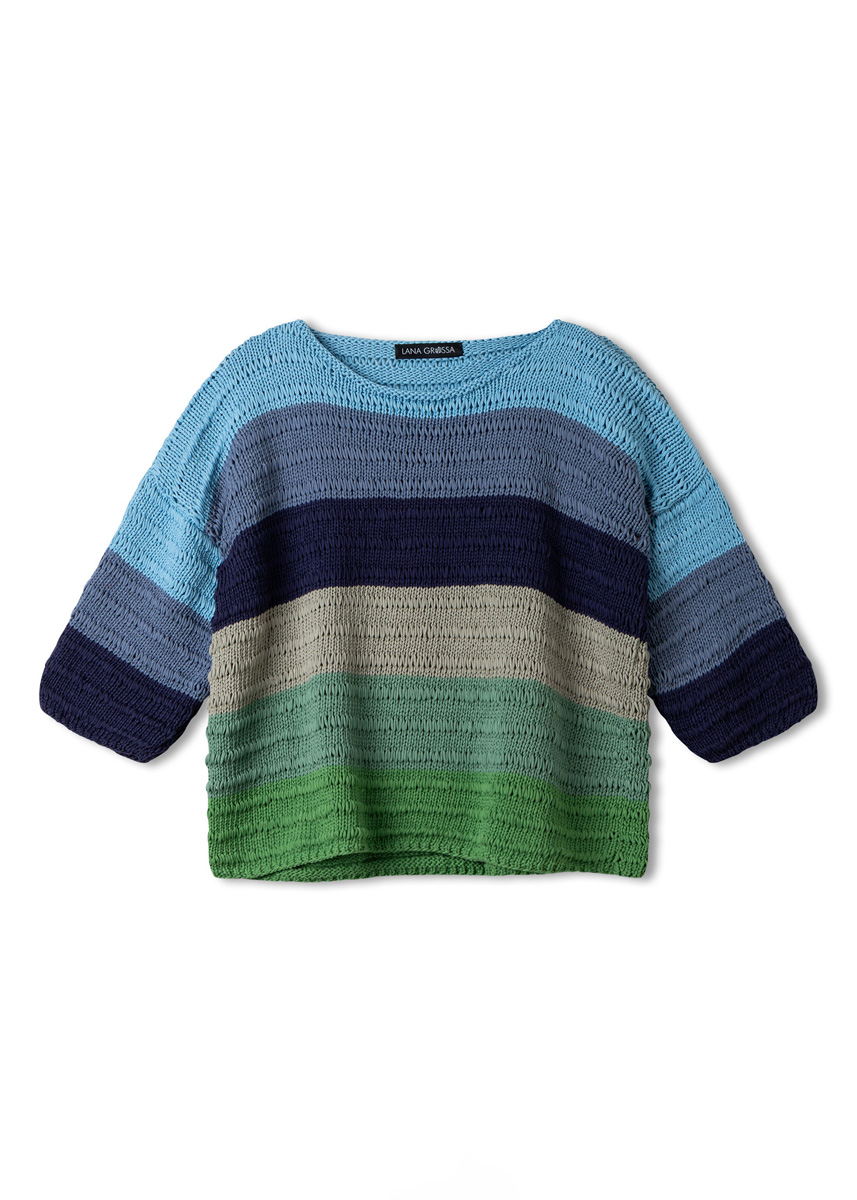 Così bella! Der gelungene Mix aus Farbe und Struktur bei den Streifen, der gerade Schnitt und das 100 % natürliche Bändchengarn gefallen uns so sehr, dass wir mit diesem SHIRT das Duo Top (03) und Pullover (23) gern zu einem Trio erweitern.