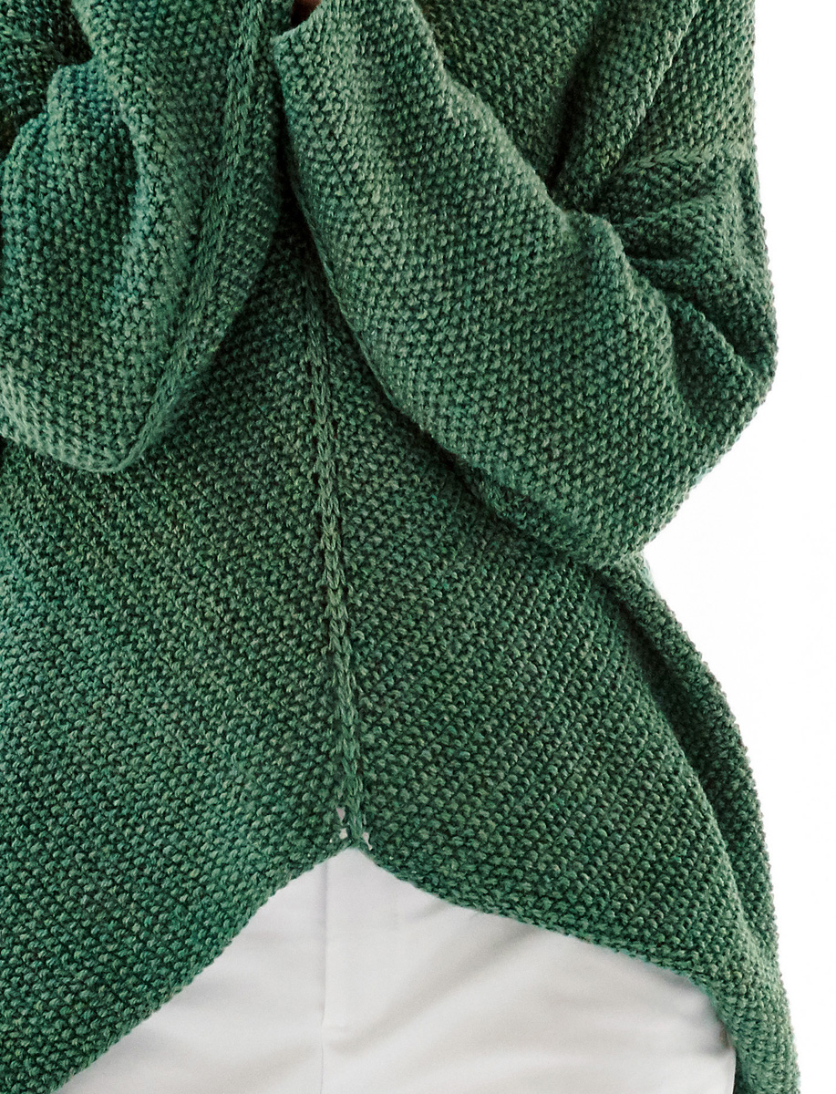 Lana Grossa Tre Seta (40% Schurwolle Merino, 35% Seide, 20% Baby Alpaka, 5% Viskose, Lauflänge 130 m/50 g), 550 (600 – 650 – 700) g Grün (Fb 12); Stricknadeln Nr. 5, 1 Häkelnadel Nr. 4.