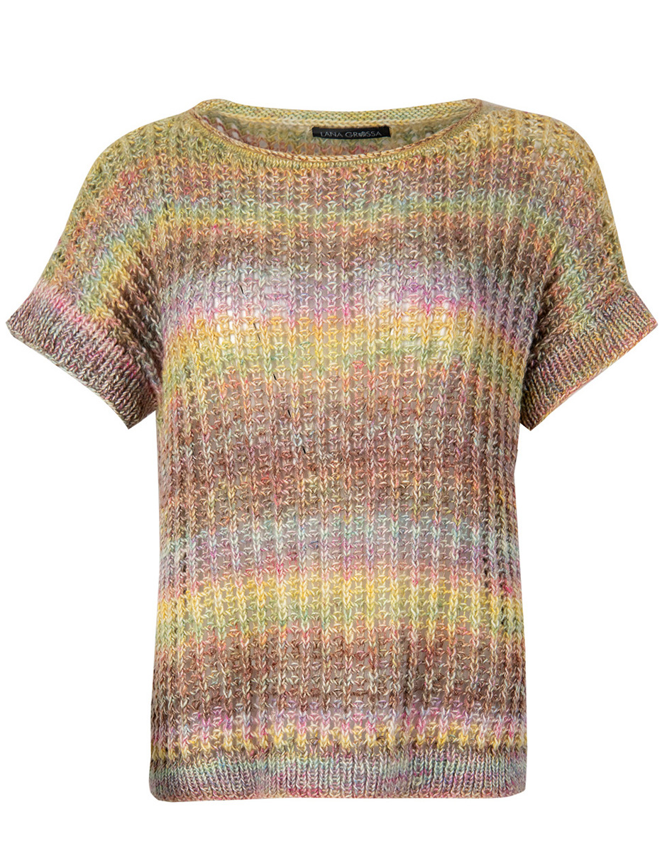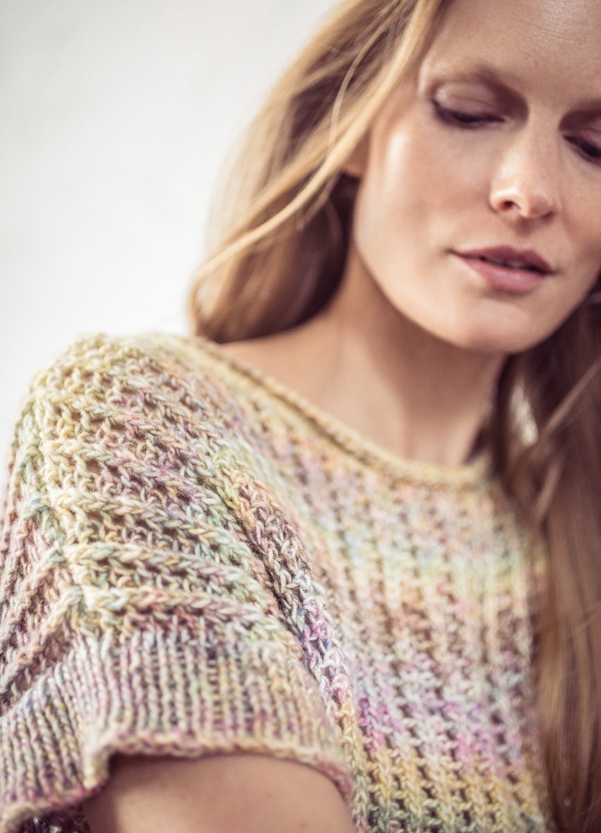 Lana Grossa Tropico (70% Baumwolle, 30% Schurwolle Merino, Lauflänge 125 m/50 g), 350 (400 – 450) g Pistazie/Lindgrün/Terracotta/ Khaki/Zyklam/Lila/Rosa/Gelb (Fb 1); Stricknadeln Nr. 4,5 und 5, 1 Rundstricknadel Nr. 4,5, 40 cm lang.