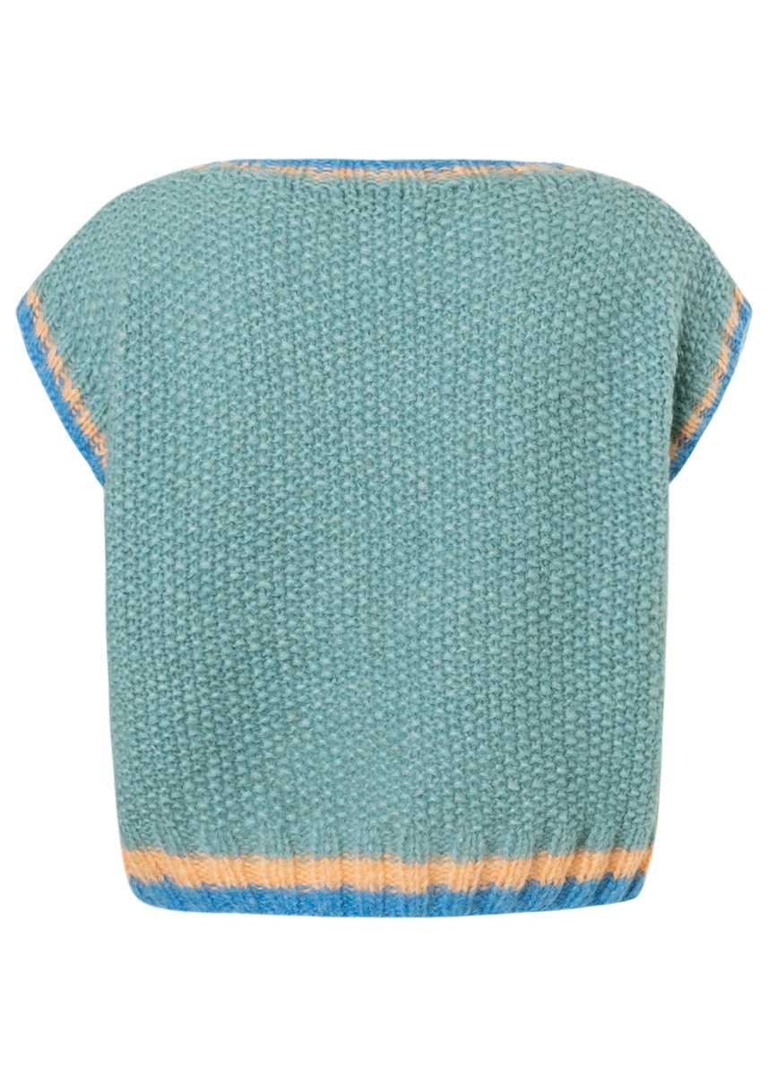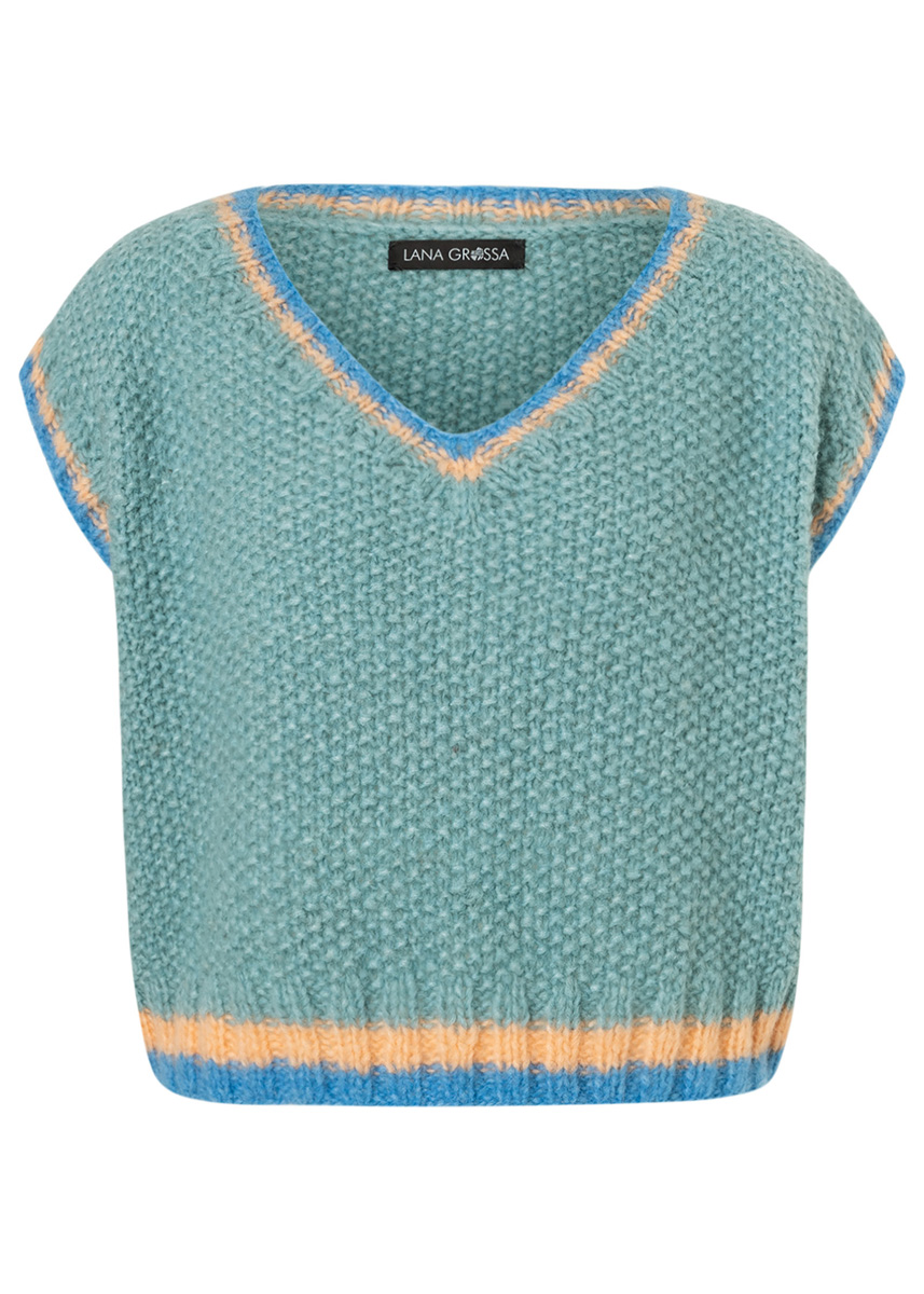 Gestreifte Blenden bescheren diesem Perlmuster-Pullunder einen klassischen College-Charakter. Sein sanftes Farbenspiel aus Eisblau (Grundfarbe) und Lachs wird durch das leuchtende Himmelblau (Blenden) trendgerecht aufgepeppt.