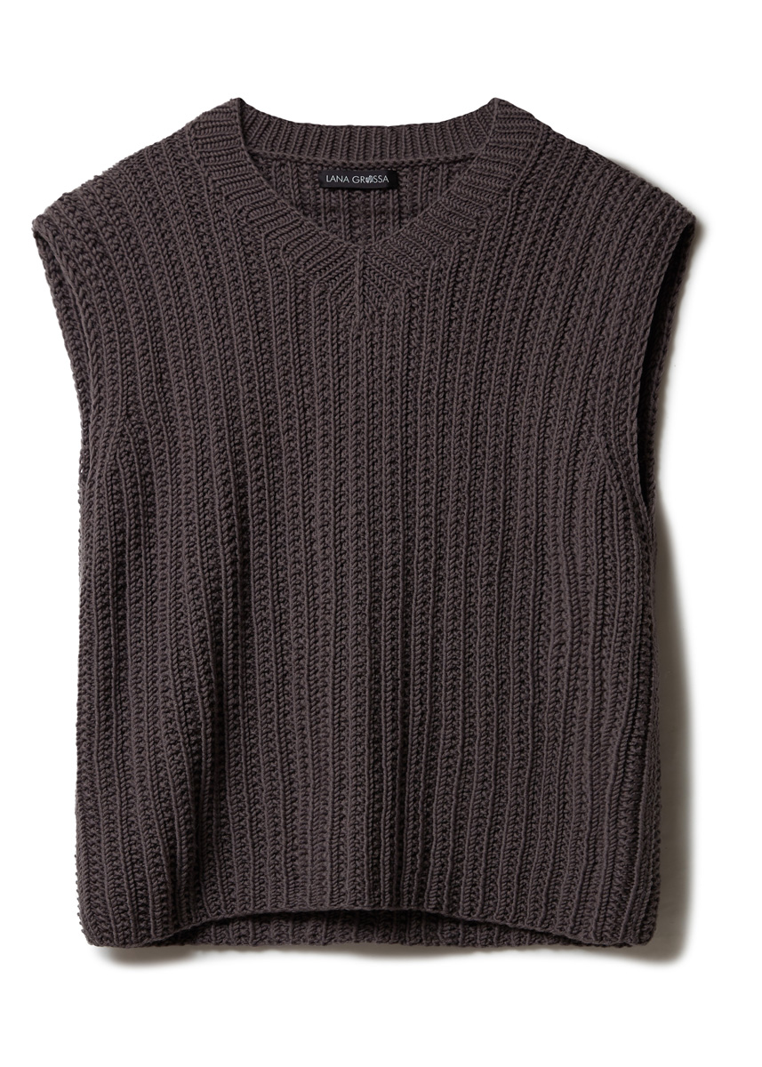 Lana Grossa Bingo (100% Schurwolle (Merino), Lauflänge 80 m/50 g), 600 (650 – 700) g Schiefergrau (Fb. 129); Stricknadeln Nr. 5, sowie 1 Rundstricknadel Nr. 4, 40 cm lang.