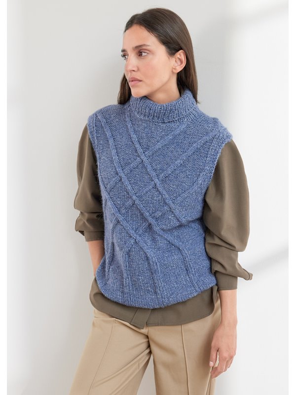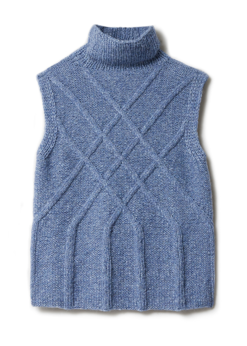 Beim jeansblauen Pullunder sorgt Netzgarn für klar definierte Strukturen. Die effektvollen Biesen werden, wie bei Zopfmustern, mit einer Hilfsnadel gestrickt.