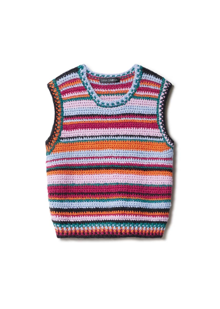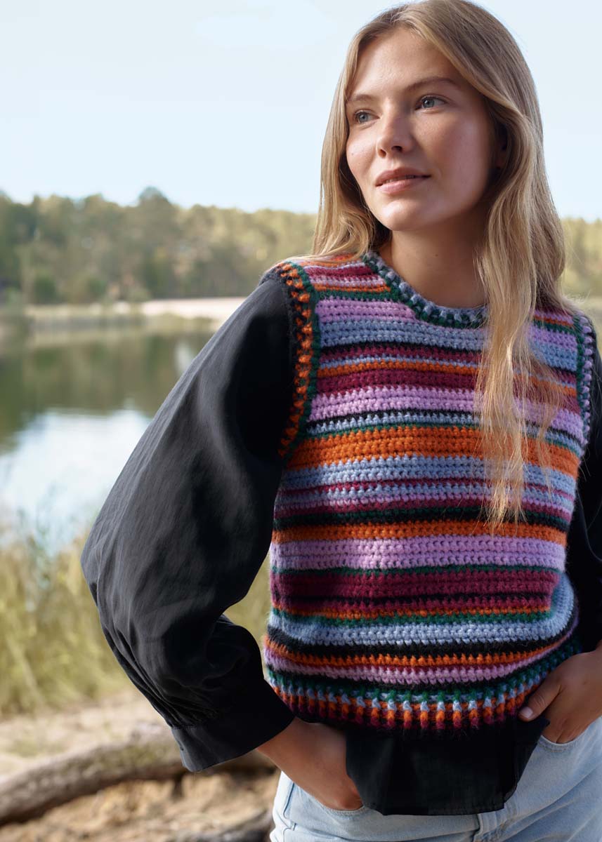 Dekorative Blenden (Reliefstäbchen) sorgen beim schmalen Pullunder für den gewissen Twist. Seine leuchtenden Töne wirken, durch den Mix mit dunklen Ringeln, besonders intensiv.