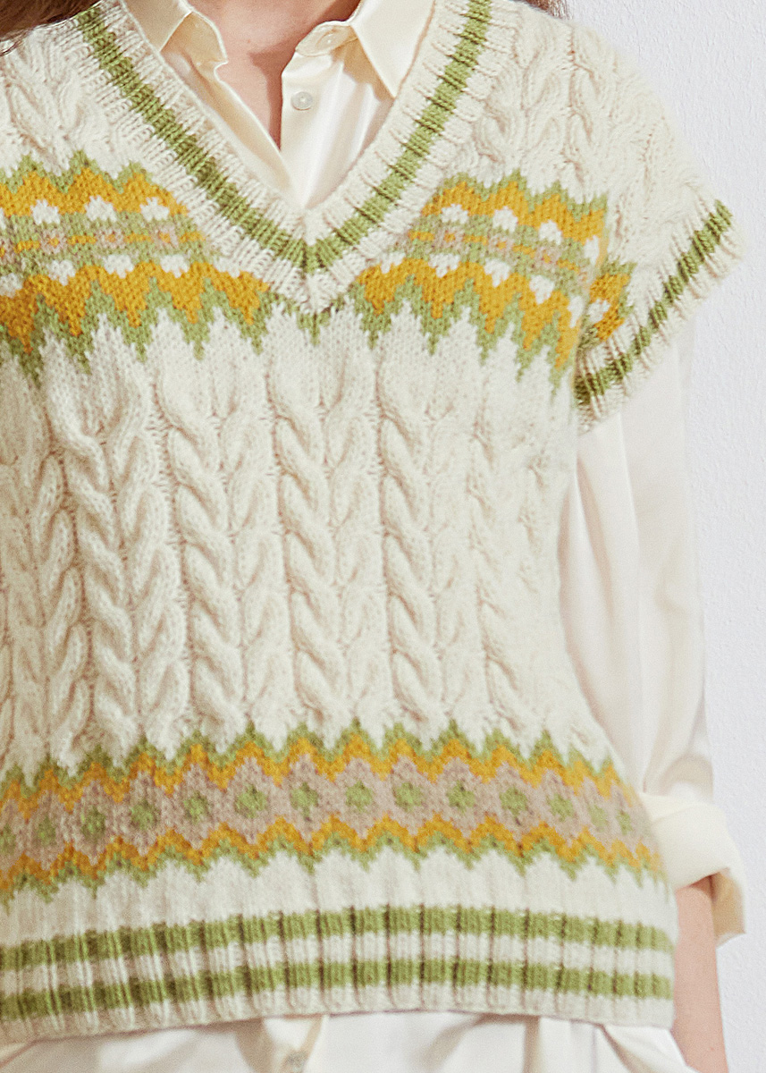 Für Fortgeschrittene: Beim Kaschmir-Pullunder in Rohweiß, Gelb, Hellgrün und Grège sorgen Jacquards, Zöpfe und Streifen für irische Folklore und eine Prise College-Chic.