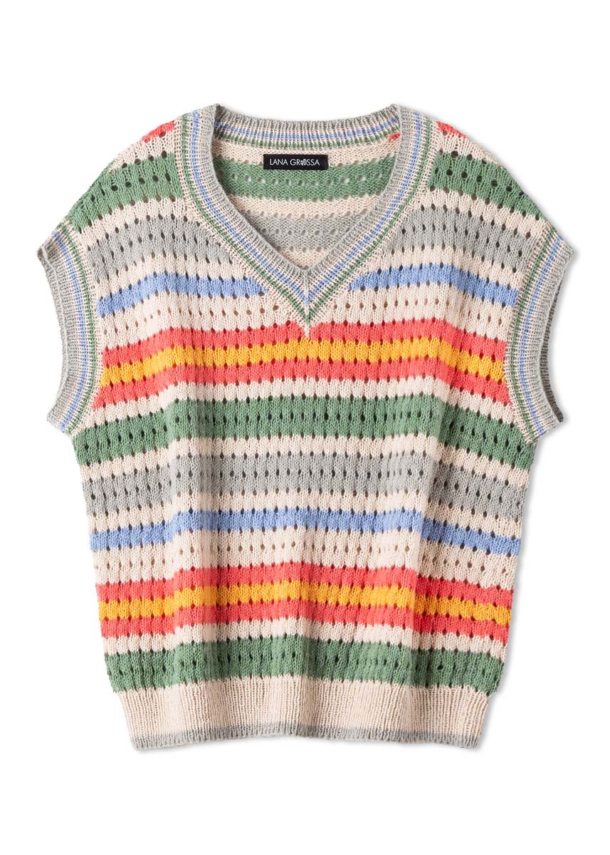 Lochmuster, College-Streifen, dazu Retro-Töne und eine lockere Passform: Ein Pullunder, der Köpfe verdreht.