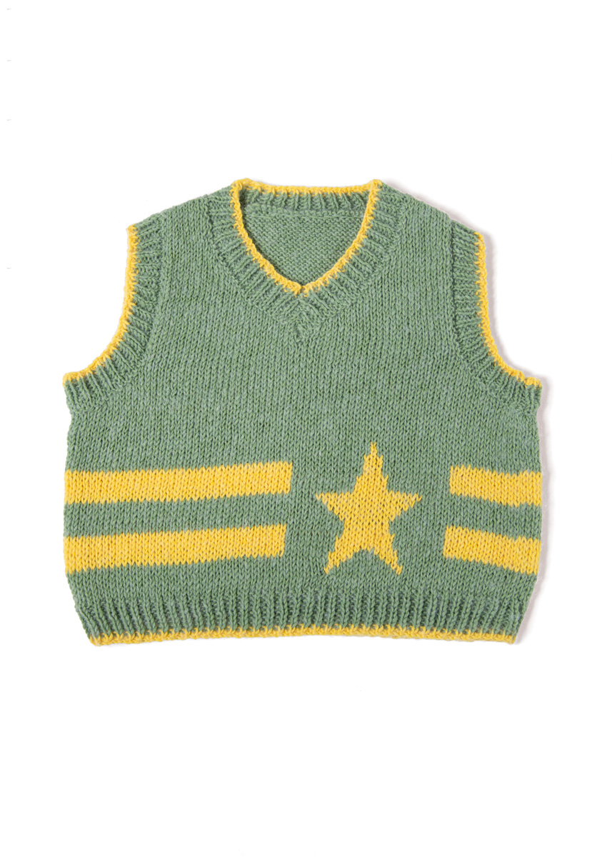 Lana Grossa Ecopuno (72% Baumwolle, 17% Schurwolle (Merino), 11% Alpaka (Baby); LL = 215 m/50 g): 50 (50/100/100) g Resedagrün (Fb. 20) und 50 g Gelb (Fb. 95); je eine Rundstricknadel 3,5 mm und 4 mm; ein Nadelspiel 3,5 mm; Maschenmarkierer.