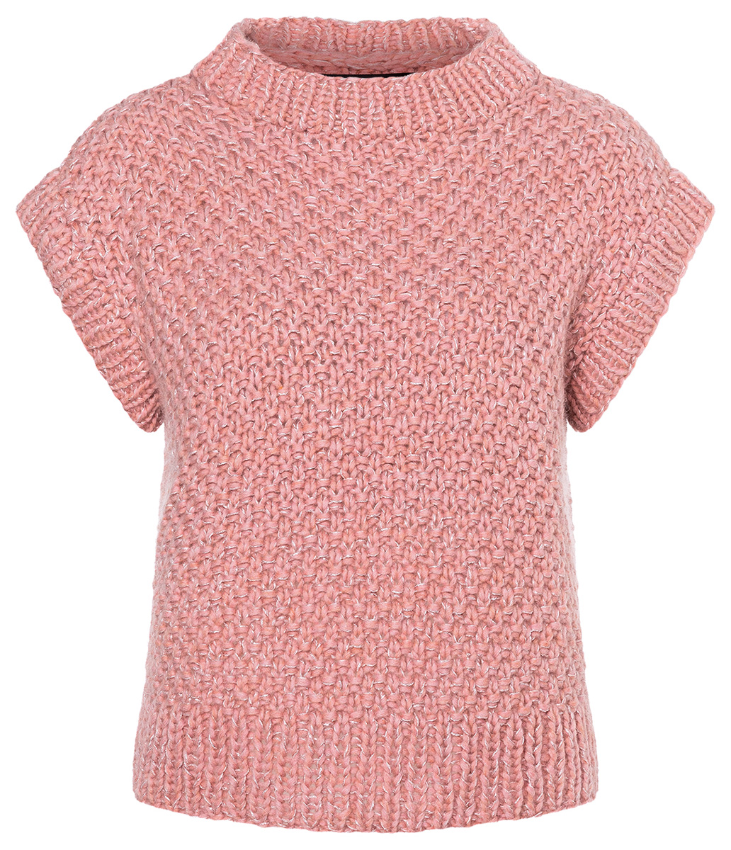 Lana Grossa Lala Berlin Lovely Cotton (75% Schurwolle (Merino) extrafein, 25% Baumwolle, Lauflänge 90 m/50 g), 300 (350 - 400) g Lachs (Fb 26) und Lana Grossa Brillino (83% Viskose, 17% Metallische Faser (Lurex), Lauflänge 200 m/25 g), 75 (100 – 100) g Weiß/Rosa (Fb 8); Stricknadeln Nr. 8 und 1 Rundstricknadel Nr. 8, 40 cm lang.
