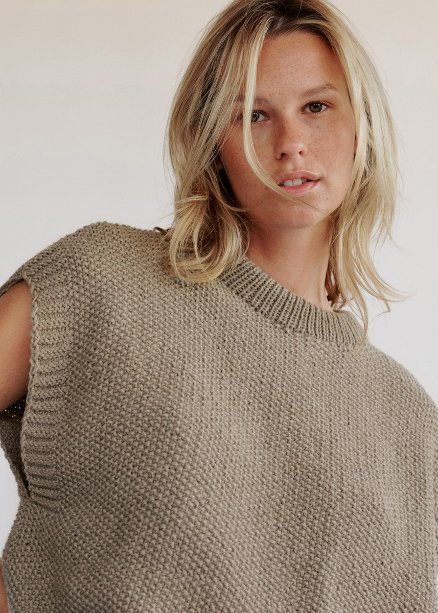 Lana Grossa-Qualität „Landlust Alpaka Merino 100” (50 % (Baby) Alpaka, 50 % Schurwolle (Merino), LL = ca. 100 m/50 g): ca. 450 (500 - 550) g Taupe (Fb. 304); Stricknadeln Nr. 4,5 und 5, 1 Rundstricknadel Nr. 4,5, 50 cm lang.