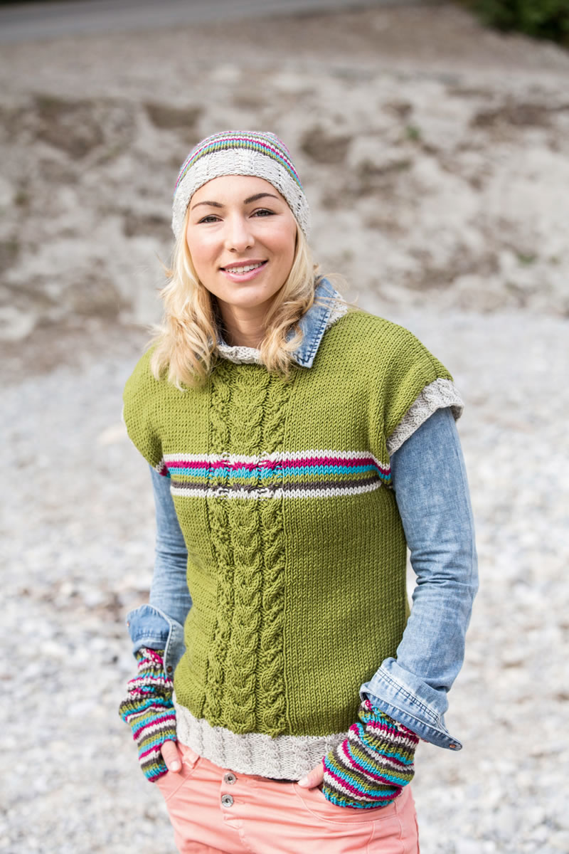 Lana Grossa Qualität „McWool Merino Mix 100“, 50 % Schurwolle, 50 % Polyacryl, Lauflänge 100 m/50 g; ca. 300 (350/350) g Oliv (Fb 115), 100 g Beige (Fb 102) und je 50 g Mokka (Fb 118), Türkis (Fb 116) und Zyklam (Fb 109), Stricknadeln Nr. 6 und 7, eine 40 cm lange Rundstricknadel Nr. 6, Zopfnadel.
