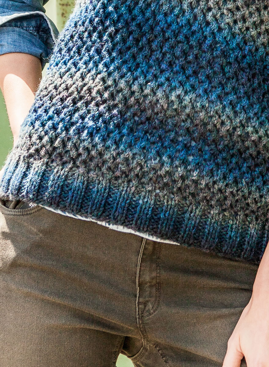 Lana Grossa „Per Tè” (65% Schurwolle Merino, 20% Polyacryl, 15% Polyamid, LL = 120 m/50 g) 300 g Jeans/Marine/ Schwarz (Fb 3). Stricknadeln Nr. 7 und Rundstricknadel 6.
