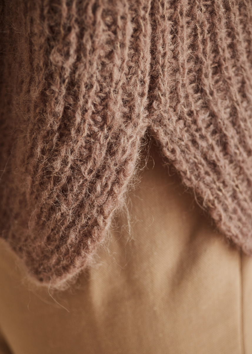 Lana Grossa-Qualität „Setasuri Big“ (70 % Alpaka (Suri), 20 % Seide, 10 % Schurwolle (Merino), LL = ca 100 m/25 g): ca 150 (175 - 175 - 200) g Nougat (Fb 518); Stricknadeln Nr 3 und 4, 1 kurze Rundstricknadel Nr 3.
