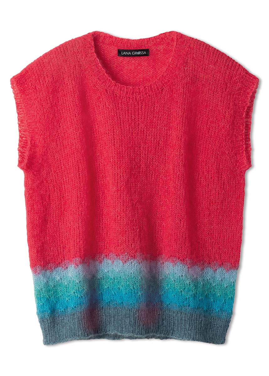 Lana Grossa-Qualität „Silkhair“ (70 % Mohair (Superkid), 30 % Seide, LL = ca 210 m/25 g): ca 100 (125 - 125 - 150) g Bonbonrot (Fb 198), ca 25 (25 - 25 - 25) g Zartblau (Fb 201), ca 25 (25 - 25 - 25) g Hellpetrol (Fb 204); ca 25 (25 - 25 - 25) g Azurblau (Fb 203) und ca 25 (25 - 50 - 50) g Rauchblau (Fb 202); Rundstricknadeln Nr 4 und Nr 4,5; 1 Häkelnadel Nr 4,5.