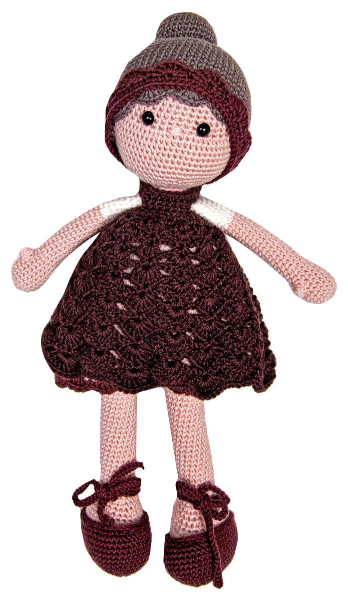 Lana Grossa Cool Wool (100 % Schurwolle, Lauflänge 160 m/50 g) 50 g Burgund (Fb 2041) und 50 g Aubergine (Fb 2069); Cool Wool Baby (100 % Schurwolle, Lauflänge 220 m/50 g) 100 g Zartrosa (Fb 267), 50 g Weiß (Fb 207) und 50 g Graubraun (Fb 211) und Cool Wool Mélange (100 % Schurwolle, Lauflänge 160 m/50 g) 50 g Fliederrosa meliert (Fb 117); Häkelnadel Nr. 3,5; Füllwatte, zwei Knöpfe mit 10 mm Ø; zwei Augen.