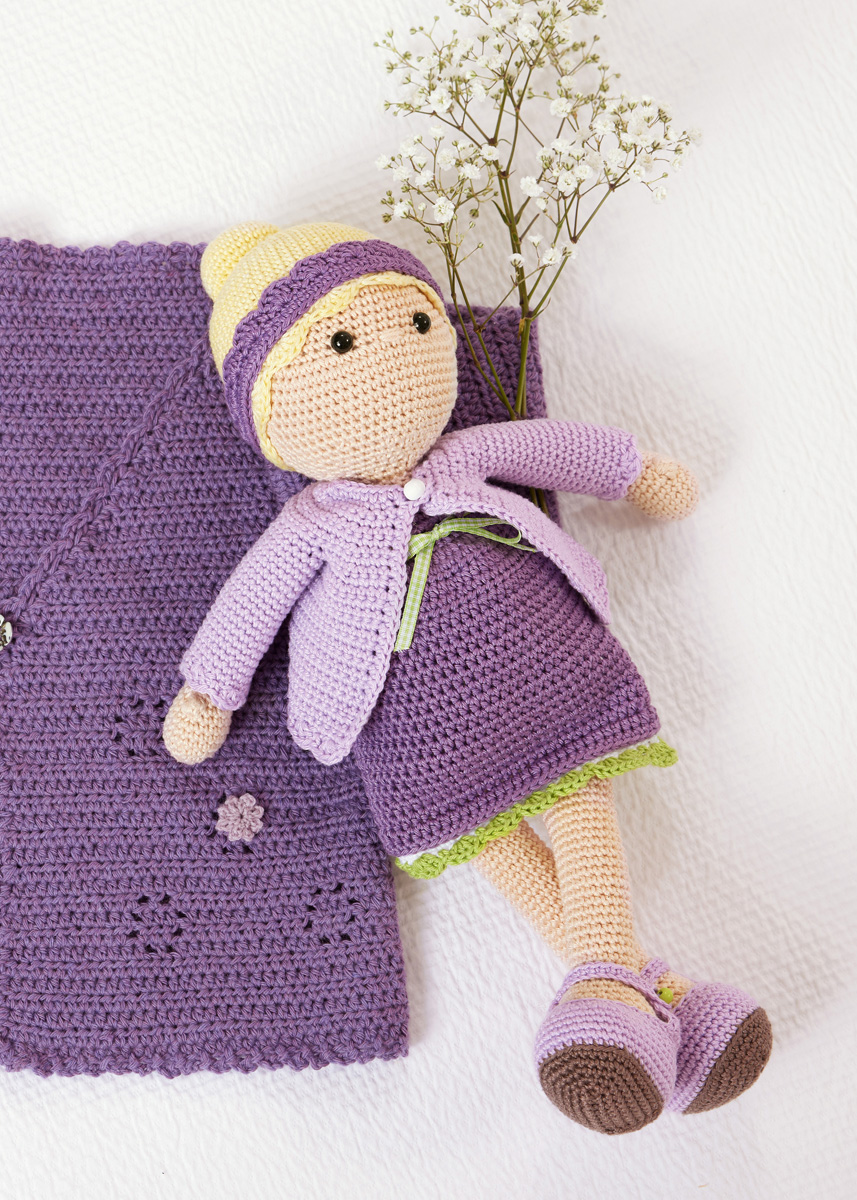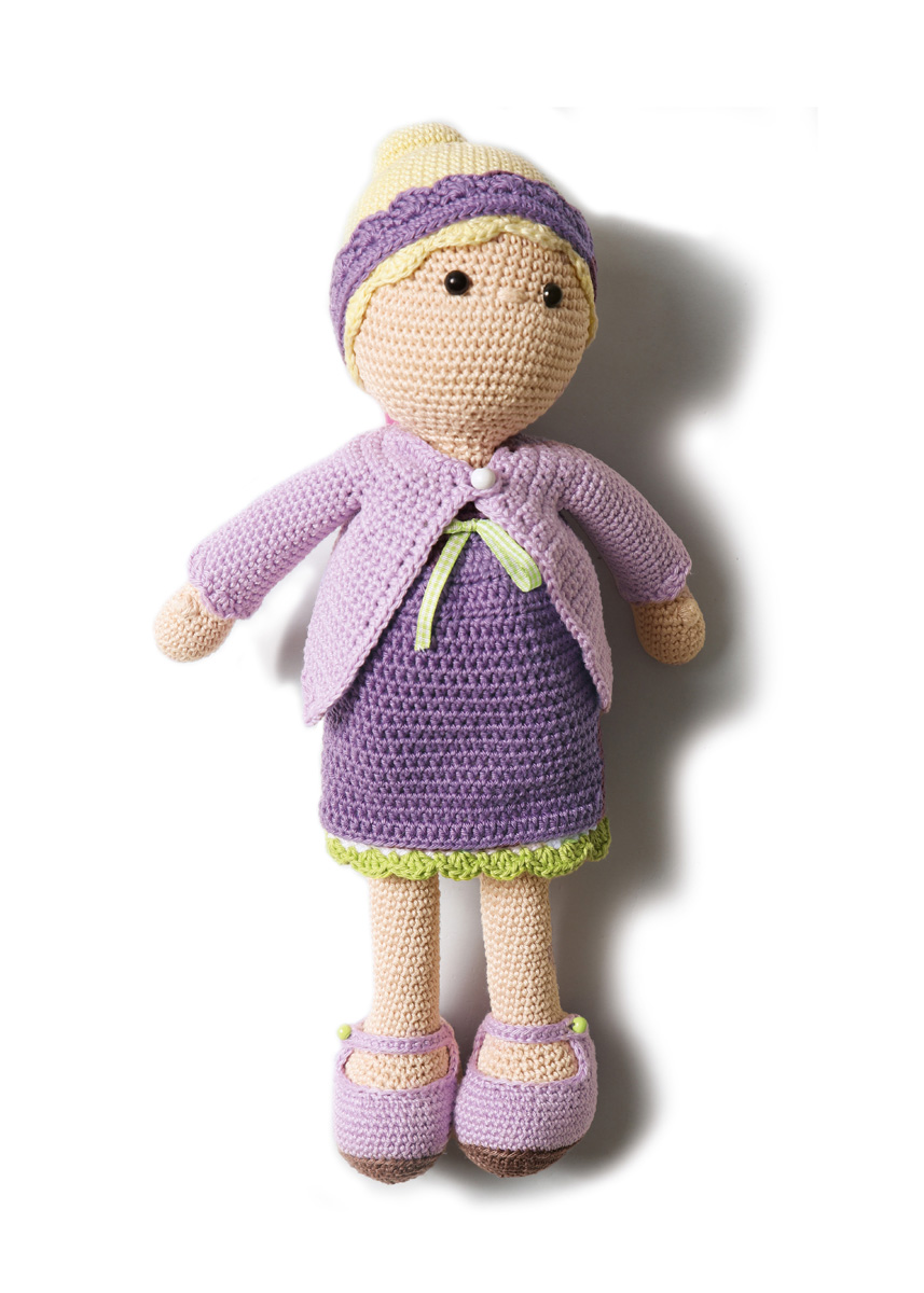 Lana Grossa Cotone (100 % Baumwolle, Lauflänge = 125 m/50 g): je 50 g Pfirsich (Fb 56), Weiß (Fb 22), Vanille (Fb 64), Pflaume (Fb 88), Pistazie (Fb 23), Flieder (Fb 7) und Graubraun (Fb 30); Häkelnadel Nr. 3; zwei schwarze Halbperlen mit 6 mm Ø; 2 grüne Holzperlen mit 4 mm Ø; eine grüne und eine weiße Holzperle mit 6 mm Ø; ca. 50 cm grün kariertes Webband, 5 mm breit; Füllwatte.