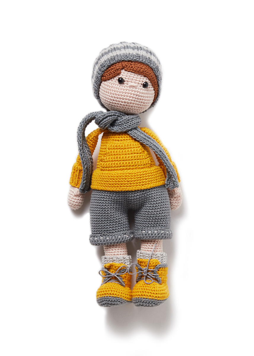 Lana Grossa-Qualität „Cotone“ (100 % Baumwolle; Lauflänge = 125 m/50 g): je 50 g Pfirsich (Fb 56), Goldgelb (Fb 38), Braun (Fb 37), Dunkelgrau (Fb 19) und Hellgrau (Fb 27); Häkelnadel 3 mm; je ein Nadelspiel 2 mm und 2,5 mm; zwei Sicherheitsaugen mit 6 mm Ø; gewachste Baumwollkordel mit 1,5 mm Ø in Grau; Füllwatte.