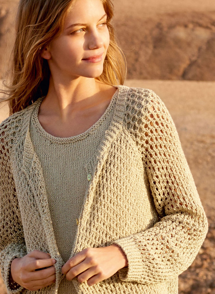 Lana Grossa-Qualität „Portofino” (60 % Baumwolle, 40 % Polyamid, LL = ca. 115 m/50 g): ca. 600 (650) g Beige (Fb. 14); Stricknadeln Nr. 3,5 und 4,5, 1 Rundstricknadel Nr. 3, 1 Wollhäkelnadel Nr. 3,5; 5 Perlmuttknöpfe von Union Knopf, Art. 46286, Fb. 38 grünbeige, 15 mm ø.