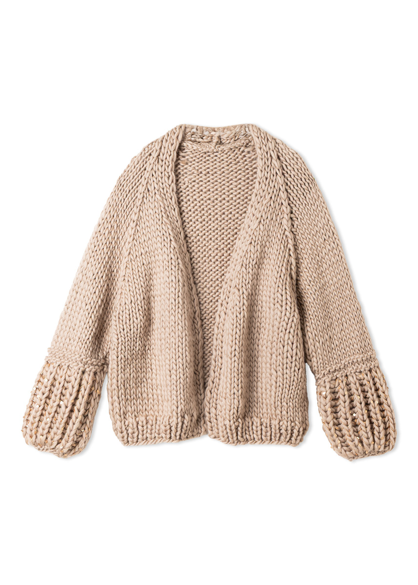 (100 % Schurwolle (Merino), LL = ca. 50 m/100 g): ca. 1000 (1100 – 1200) g Beige (Fb. 115) und Lana Grossa-Qualität „Cosmo” (100 % Baumwolle (plus Pailletten), LL = ca. 260 m/100 g): ca. 100 g Wüstengelb (Fb. 9); Stricknadeln Nr. 10 und 12, je 1 Rundstricknadel Nr. 10 und 12, 120 cm lang; 3 farblich passende Knöpfe, ø 28 mm.
