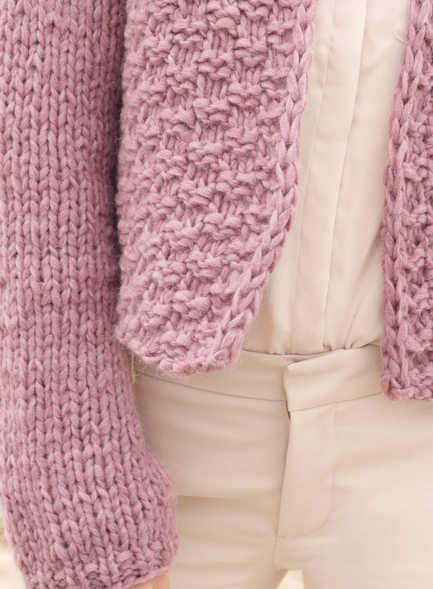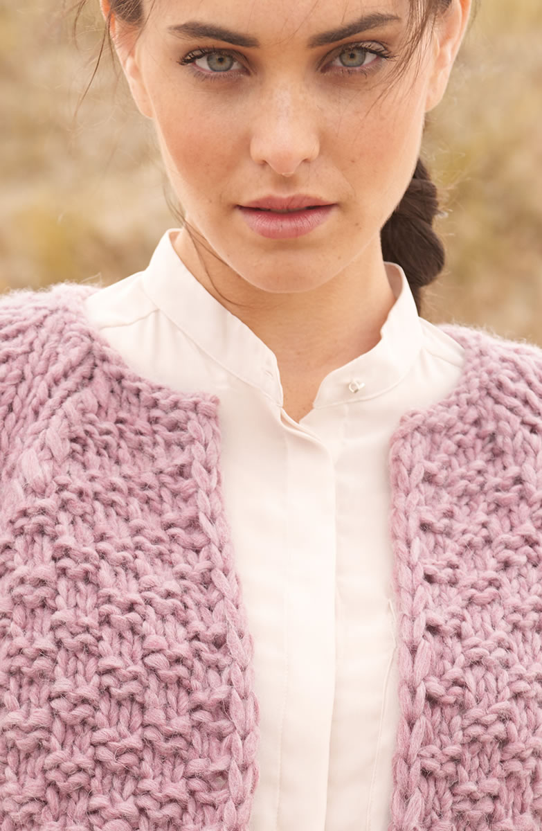 EIN BASIC DER EXTRAKLASSE! Diese Strickjacke aus einem extraweichen, gefilzten Wollbändchen gönnen wir uns in einem zarten Roséton. Ein Styling-Allrounder, der mit Würfelmuster und offener Vorderseite einfach chic und zudem sehr lässig wirkt.