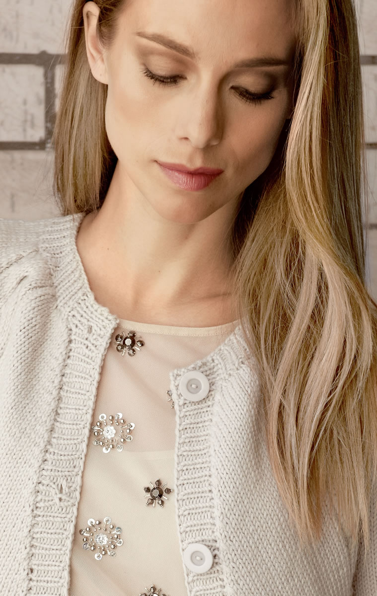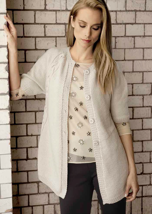 Lana Grossa-Qualität „Pashmina” (78 % Schurwolle (Merino extrafine, filzfrei), 22 % Kaschmir, LL = ca. 125 m/50 g): ca. 500 g Grège (Fb. 63); Stricknadeln Nr. 4 und 5, 1 Rundstricknadel Nr. 4, 60 cm lang; 4 Knöpfe von Union Knopf, Art. 451064, 22 mm Ø, Fb. 74 grège.
