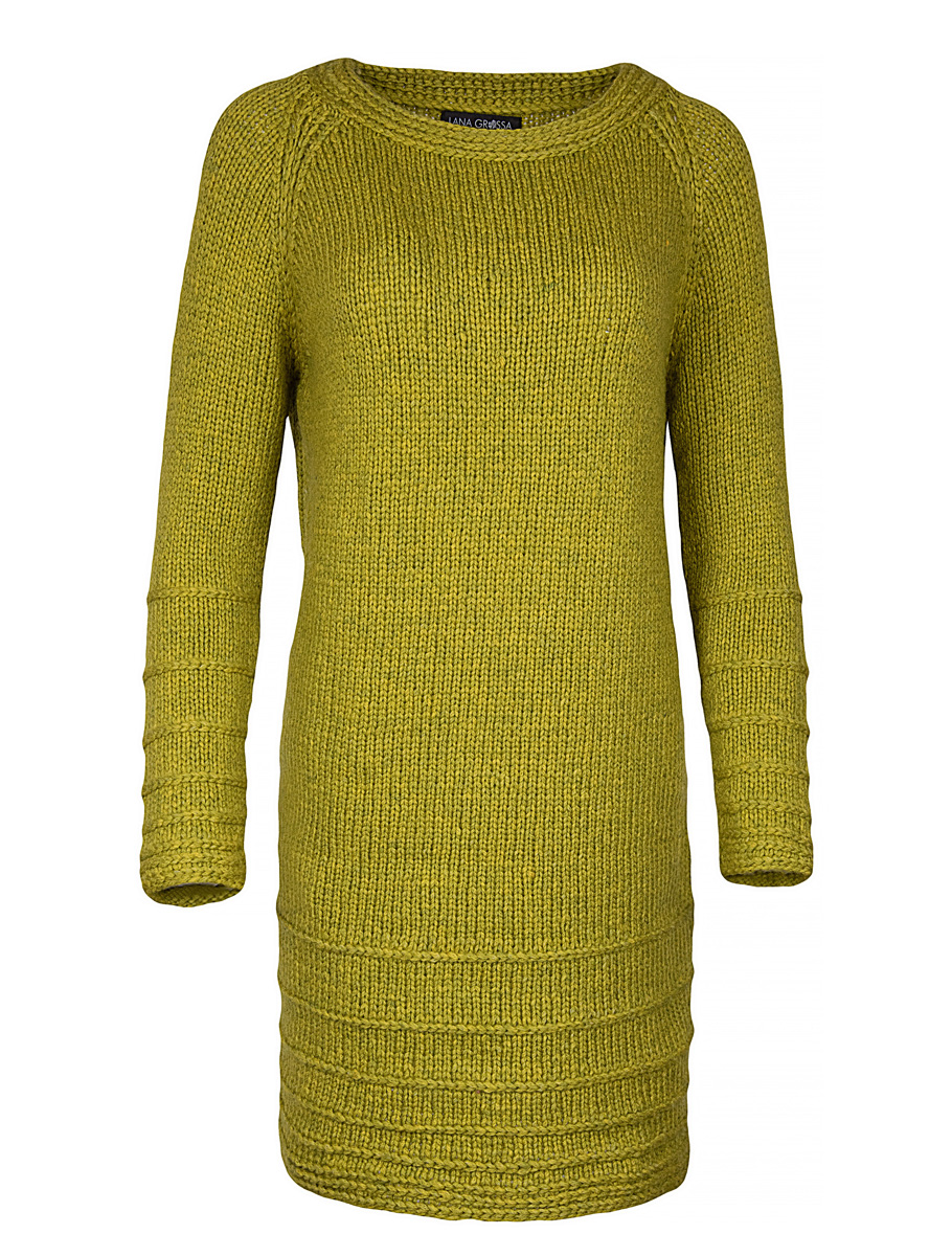 Lana Grossa-Qualität „Alta Moda Cashmere 16“ (78 % Schurwolle (Merino), 12 % Kaschmir, 10 % Polyamid, Lauflänge 110 m/50 g): ca. 550 g Senf/Oliv (Fb. 36); Stricknadeln Nr. 7, 1 Rundstricknadel Nr. 7, 50 cm lang.