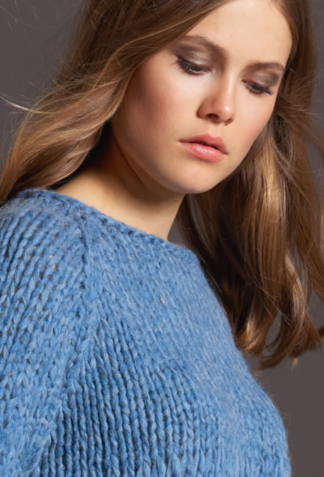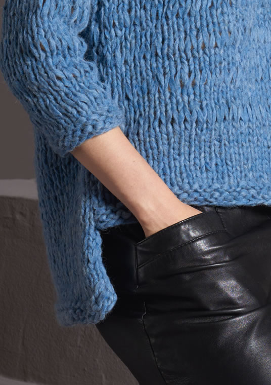 Lana Grossa-Qualität „Ambiente” (70 % Schurwolle (Merino extrafine), 30 % (Baby) Alpaka, LL = ca. 80 m/50 g): ca. 500 (550 – 600) g Jeans (Fb. 1); Stricknadeln Nr. 12, 1 Rundstricknadel Nr. 12, 60 cm lang.