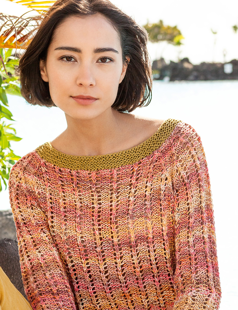 Beim Pulli in angesagter Sweatshirt-Form sorgen Loch-Effekte und das neue bedruckte Garn für Sommerfrische vom Feinsten.