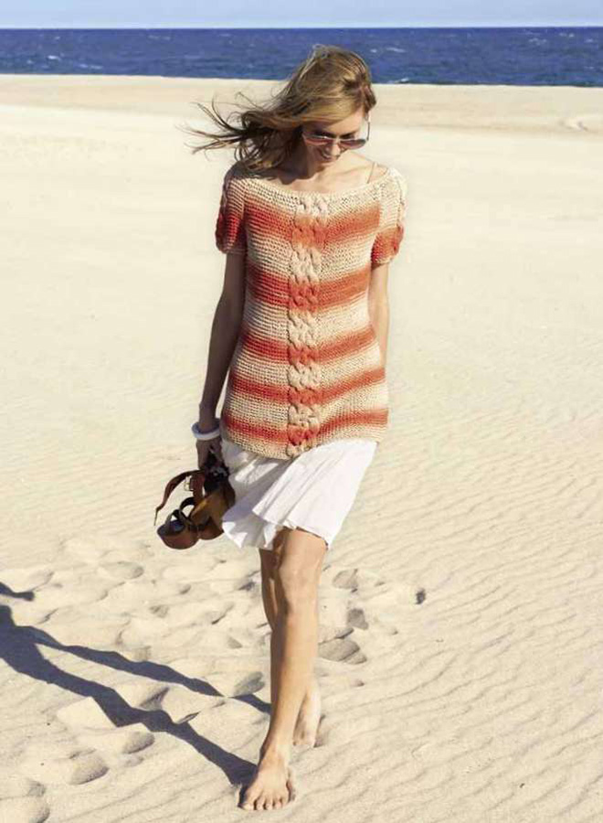 Lana Grossa- Qualität „Panama” (100 % Baumwolle, LL = ca. 90 m/50 g): ca. 600 (650) g Beige/ Lachs/Koralle (Fb. 8); Stricknadeln Nr. 6, 1 Wollhäkelnadel Nr. 4.