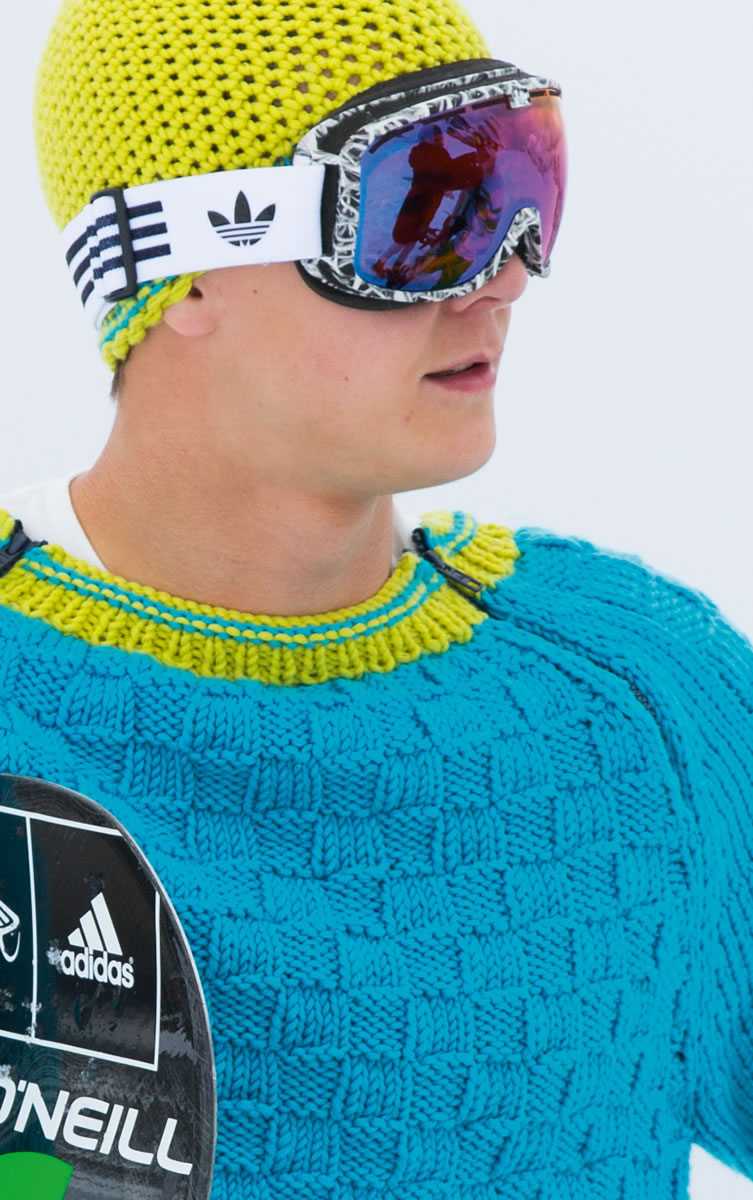 Lana Grossa „Superbingo” (100% Schurwolle, LL = 55 m/50 g) 800 g Türkis (Fb 2) und 150 g Gelbgrün (Fb 30). Stricknadeln Nr. 6 und 7, eine Rundstricknadel Nr. 6, 2 Reißverschlüsse in Schwarz. 18 cm lang (von Prym).