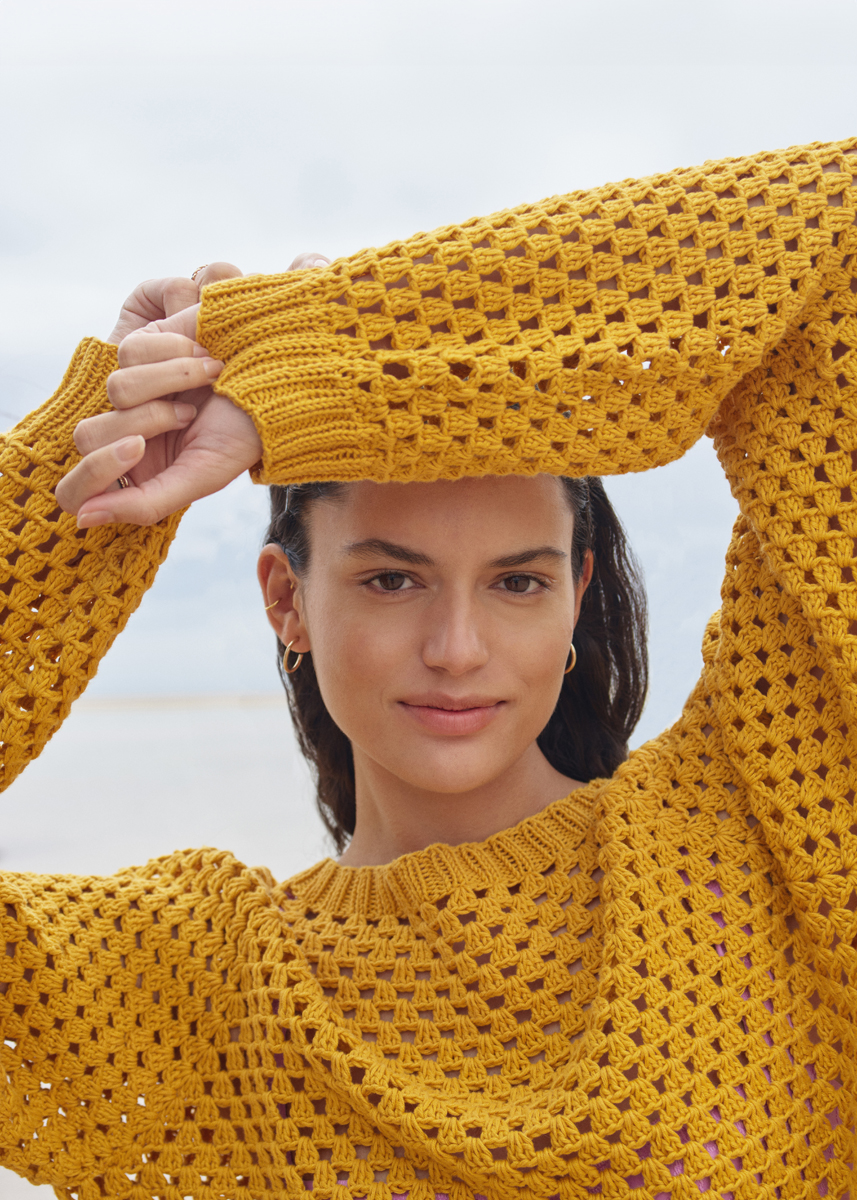 Lana Grossa-Qualität „Landlust Baumwolle” (100 % (Bio) Baumwolle, LL = ca. 115 m/50 g): ca. 650 g Goldgelb (Fb. 6); 1 Wollhäkelnadel Nr. 4, je 1 Rundstricknadel Nr. 3,5, 50 und 80 cm lang, Spielstricknadeln Nr. 3,5.