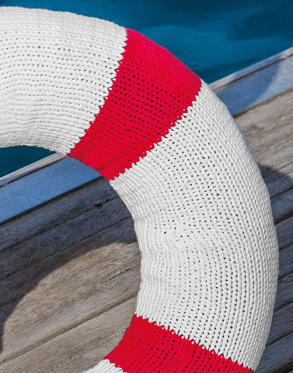 Lana Grossa-Qualität „McWool Cotton mix 80” (50 % Baumwolle, 50 % Polyacryl, LL = ca. 80 m/50 g): ca. 250 g Rohweiß (fb. 509) und ca. 100 g Rot (fb. 503); Stricknadeln Nr. 5, 1 aufblasbarer Rettungsring, 50 cm.