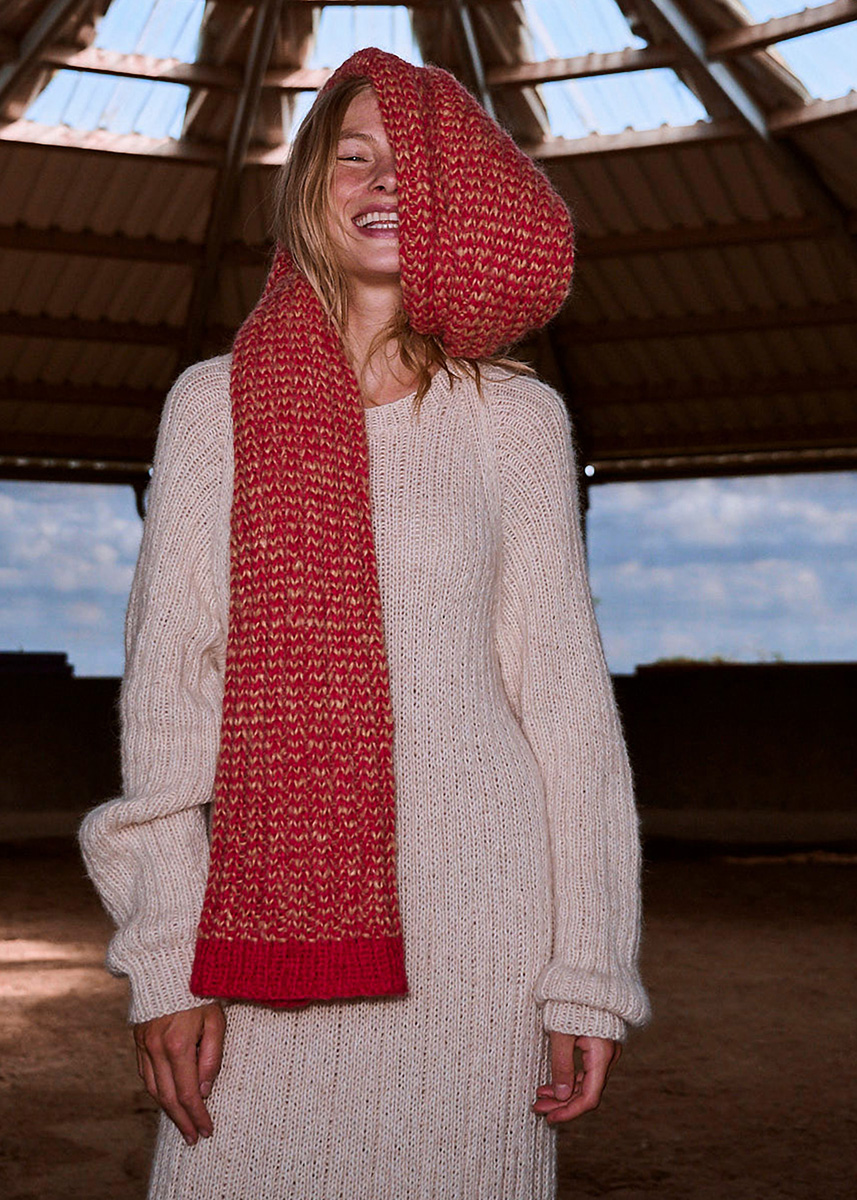 Garn von Lana Grossa, Qualität „Setasuri Big“ (70 % Alpaka, 20 % Seide, 10 % Schurwolle, Lauflänge 100 m/25 g): 200 g in Camel Nr. 507 und 225 g in Rot Nr. 523. 1 lange Rundstricknadel 6 (wenn Sie locker stricken) oder 7 (wenn Sie fest stricken) – wichtig ist, dass Sie auf die Angaben in der Maschenprobe kommen.