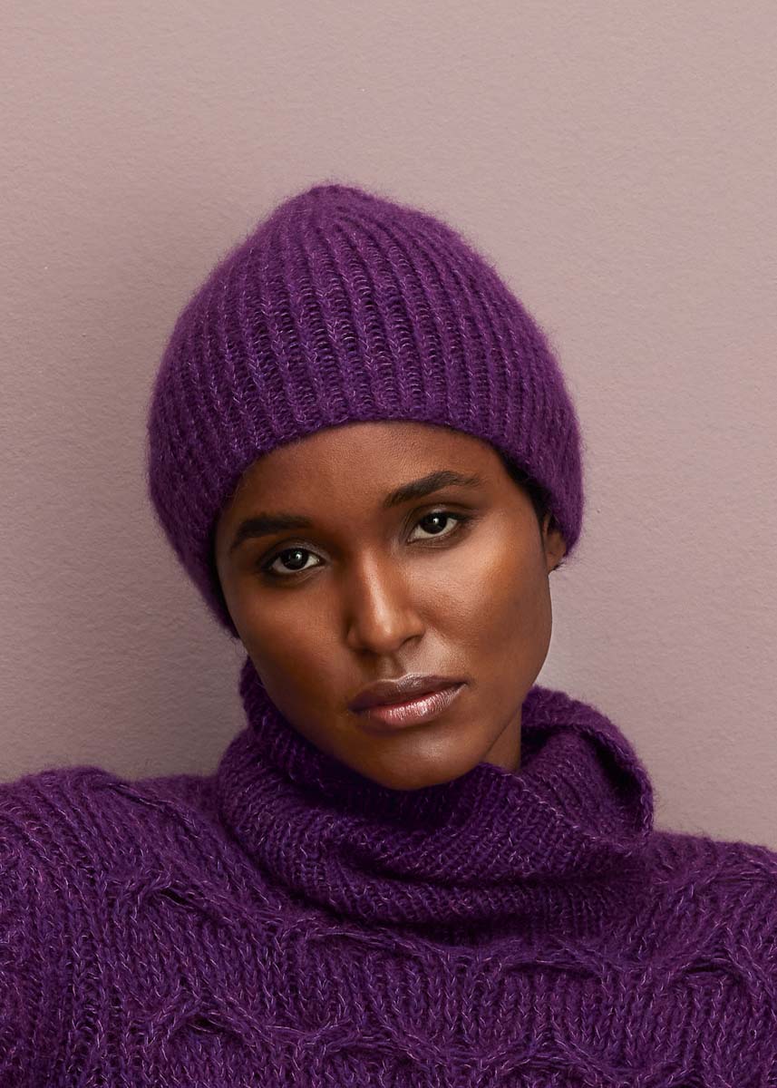 Mit Silkhair und Ecopuno vereinen sich nicht nur zwei unserer beliebtesten Garne, sondern auch ein „Best of“ kostbarer Fasern zur feinen Mélange. Schönes Detail: Ärmelbündchen, bei denen Ecopuno einen Solo-Part hat. Die einfach gerippte Mütze macht den eleganten Look komplett.