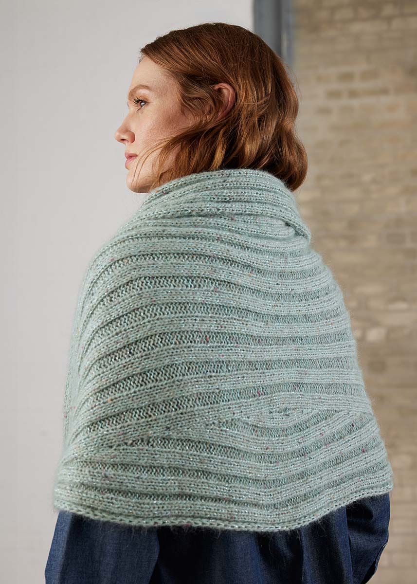 Ecopuno (72% Baumwolle, 17% Schurwolle (Merino), 11% Alpaka (Baby), Lauflänge 215 m/50 g), 250 g in Graubeige (Fb. 93), Lana Grossa Brillino (83% Viskose, 17% Metallische Faser, Lauflänge 200 m/25 g), 125 g in Pastellgrün/Silber (Fb. 11) und Lana Grossa Natural Superkid Tweed (60% Mohair (Superkid), 30% Seide, 7% Baumwolle, 3% Polyester, Lauflänge 200 m/25 g), 125 g in Graugrün (Fb. 617); 1 Rundstricknadel Nr. 5,5, 80 cm lang, 2 Maschenmarkierer.