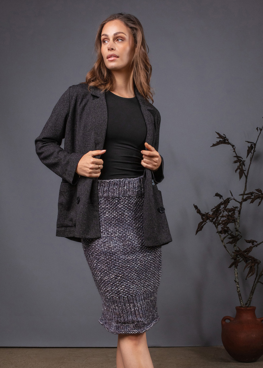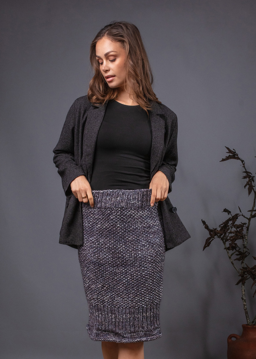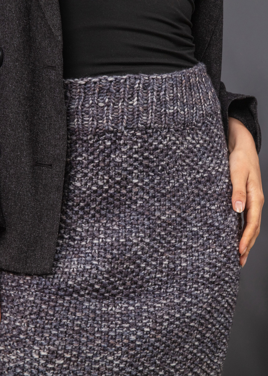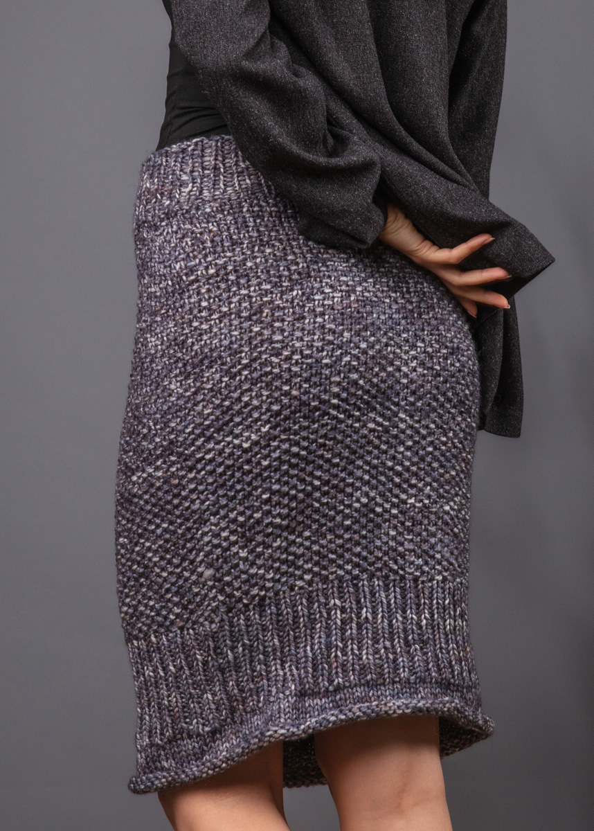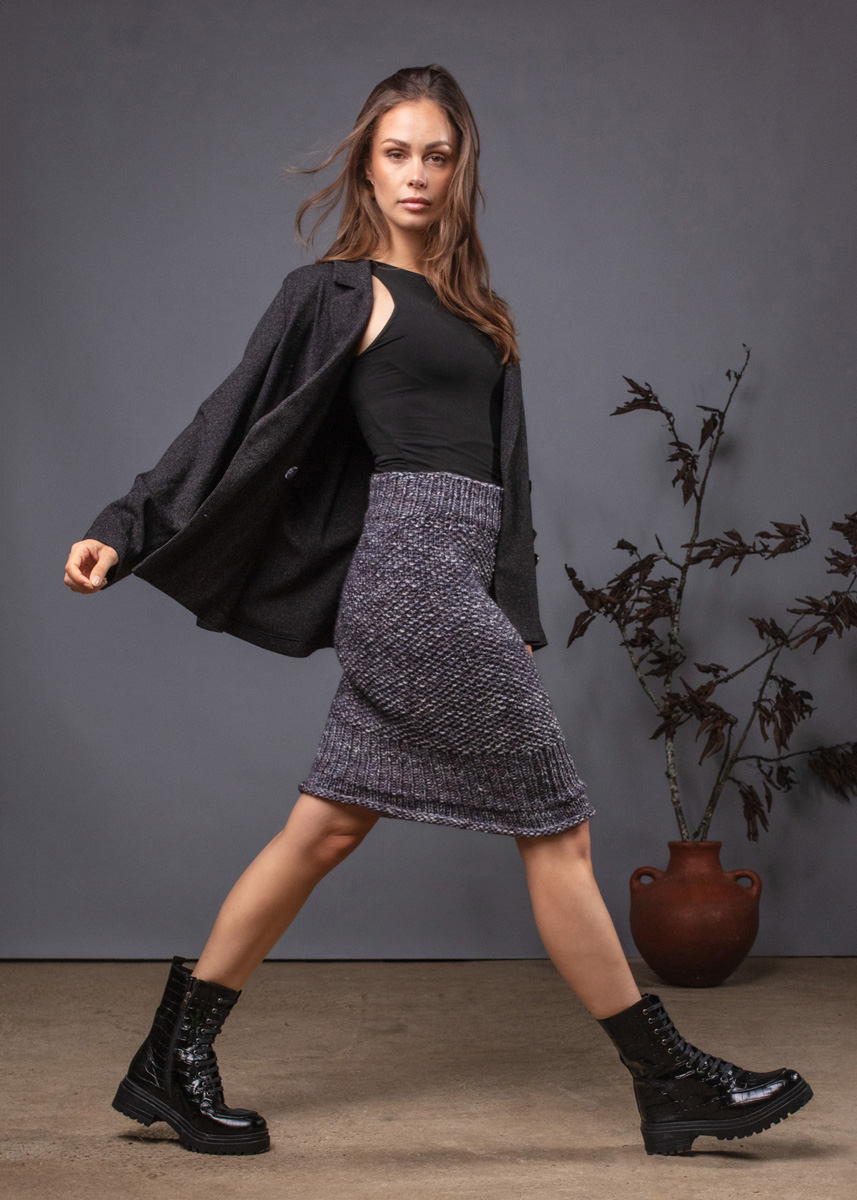 Dieser Rock kombiniert Gemütlichkeit mit einem eleganten Look. Er wird von oben nach unten gestrickt und betont durch das Rippenmuster im unteren Teil die Figur. Das Modell hat eine Gesamtlänge von 53 (55 - 57 - 57 - 60 - 60) cm und einen Hüftumfang von 86 (94 - 102 - 110 - 122 - 134) cm.