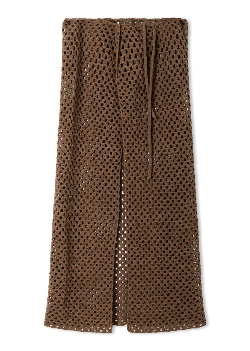 Dunkelbraunes Kreppgarn betont den luxuriösen Look dieser Filetmuster-Kombi. Stimmiges Finish: die passende Tasche mit Noppenstruktur.
