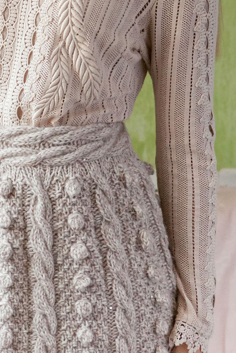 Lana Grossa-Qualität „Merino Air” (90 % Schurwolle (Merino), 10 % Polyamid, LL = ca. 130 m/50 g): ca. 350 g Hellbeige (Fb. 9) und Lana Grossa- Qualität „Lace Paillettes” (45 % (Baby) Alpaka, 20 % Schurwolle (Merino), 15 % Polyamid, 15 % Baumwolle, 5 % Polyester, LL = ca. 150 m/25 g): ca. 150 g Taupe (Fb. 2); Stricknadeln Nr. 5,5, je 1 Rundstricknadel Nr. 6,5, 120, 80 und 60 cm lang; je 3 Haken und Ösen in Silber.