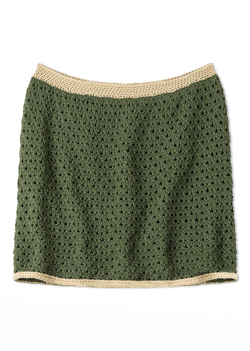 Lana Grossa „Promessa“ (70% Baumwolle (Bio), 30% Polyamid (rec.), Lauflänge 125 m/50 g), 200 (250) g in Lodengrün (Fb. 17) und 50 g in Graubeige (Fb. 15); 1 Rundstricknadel Nr. 5, 80 cm lang, 1 Häkelnadel Nr. 4,5, 1 Maschenmarkierer.