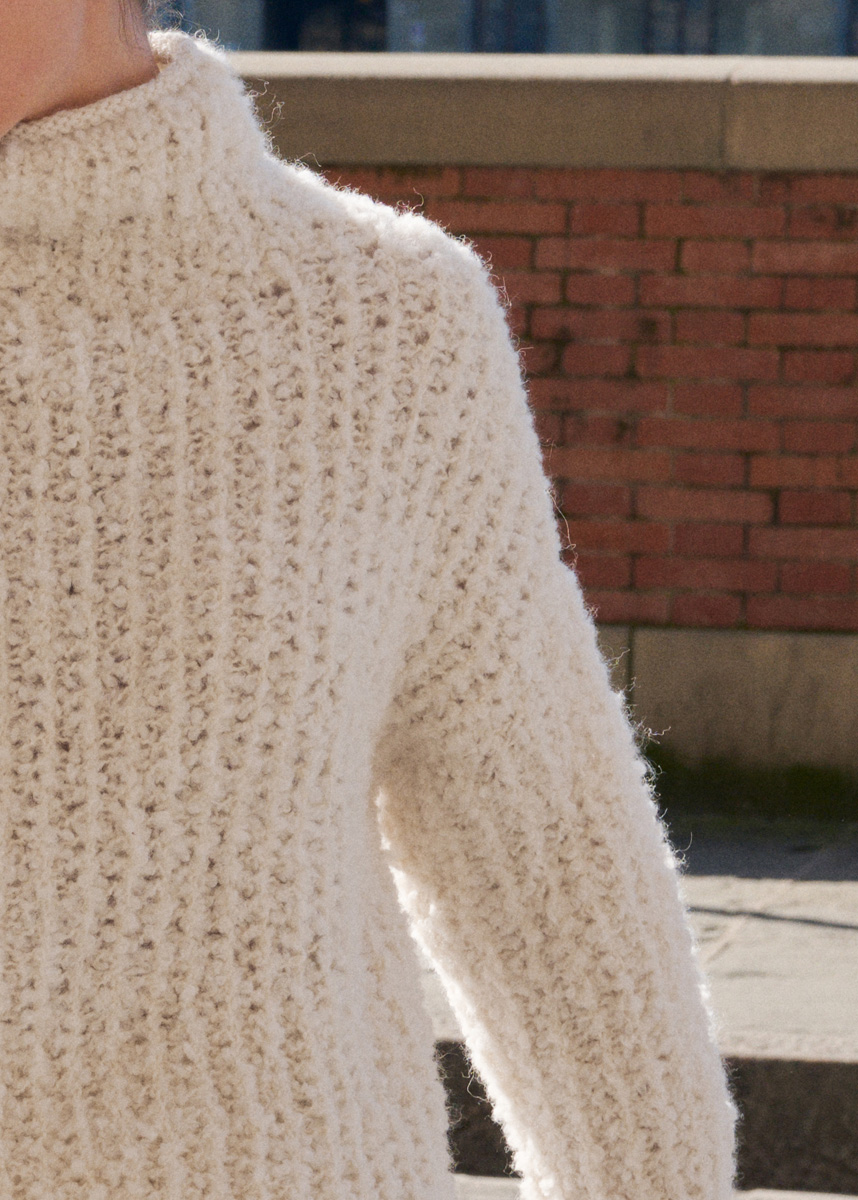 Flausch- und Bouclé-Garn sorgen beim klassischen, zweifädig gestrickten Halbpatent-Pulli für eine neue, spektakuläre Optik.