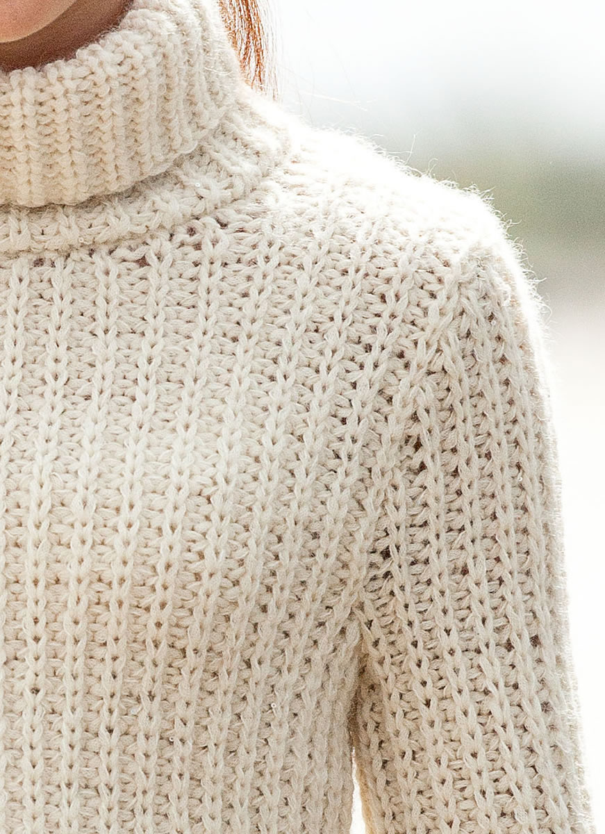 Styling-Joker gefällig? Der cremefarbene Grobstricker ist zeitlos, passt zu allem und bringt Licht in trübe Winter-Looks.