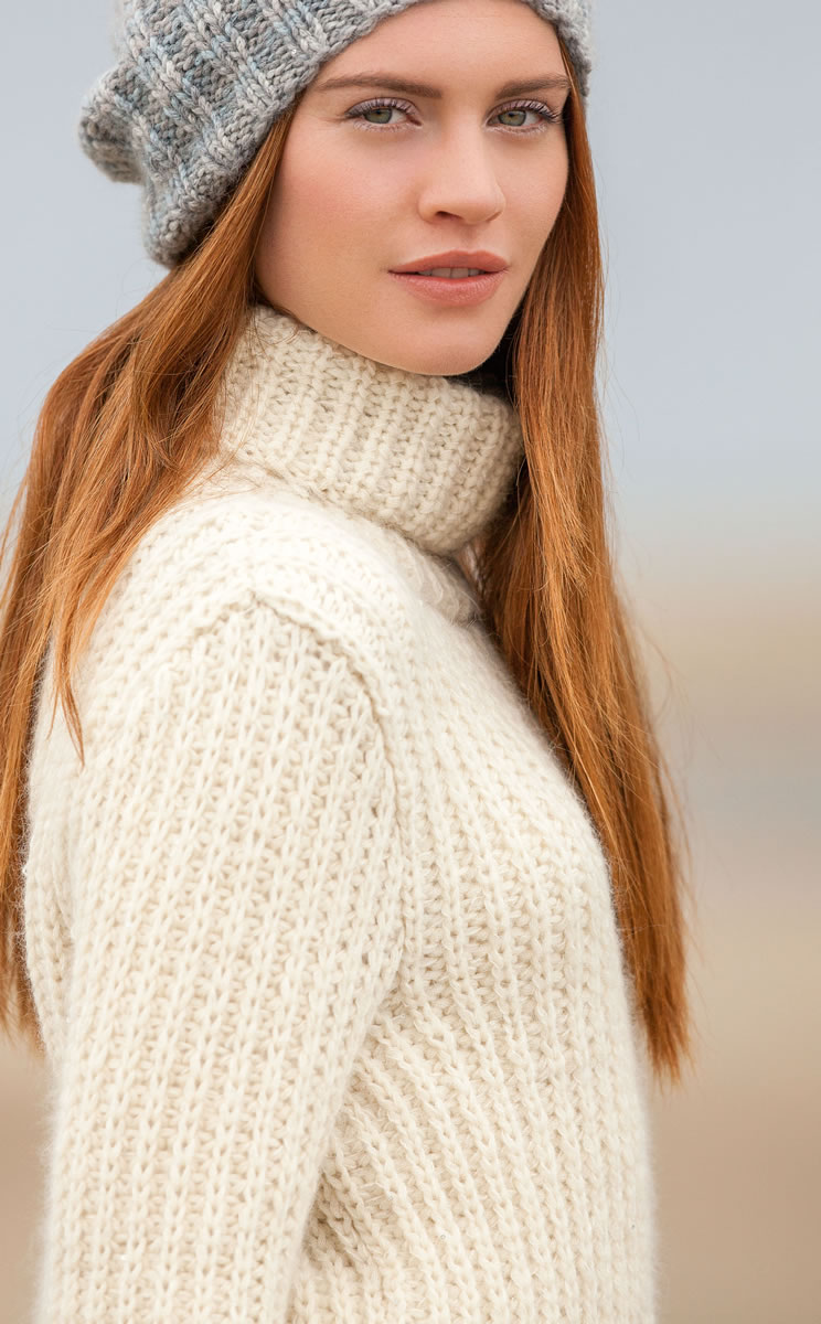 Lana Grossa Colmo (55 % Schurwolle, 25 % Alpaka, 20 % Mohair, Lauflänge 120 m/50 g) 550 (600-650) g Rohweiß (Fb 1) und Silkhair Paillettes (61 % Mohair, 17 % Polyamid, 11 % Seide, 11 % Schurwolle, Lauflänge 155 m/25 g) 150 (175-200) g Ecru (Fb 415); Stricknadeln Nr. 8, eine 40 cm lange Rundstricknadel Nr. 8.