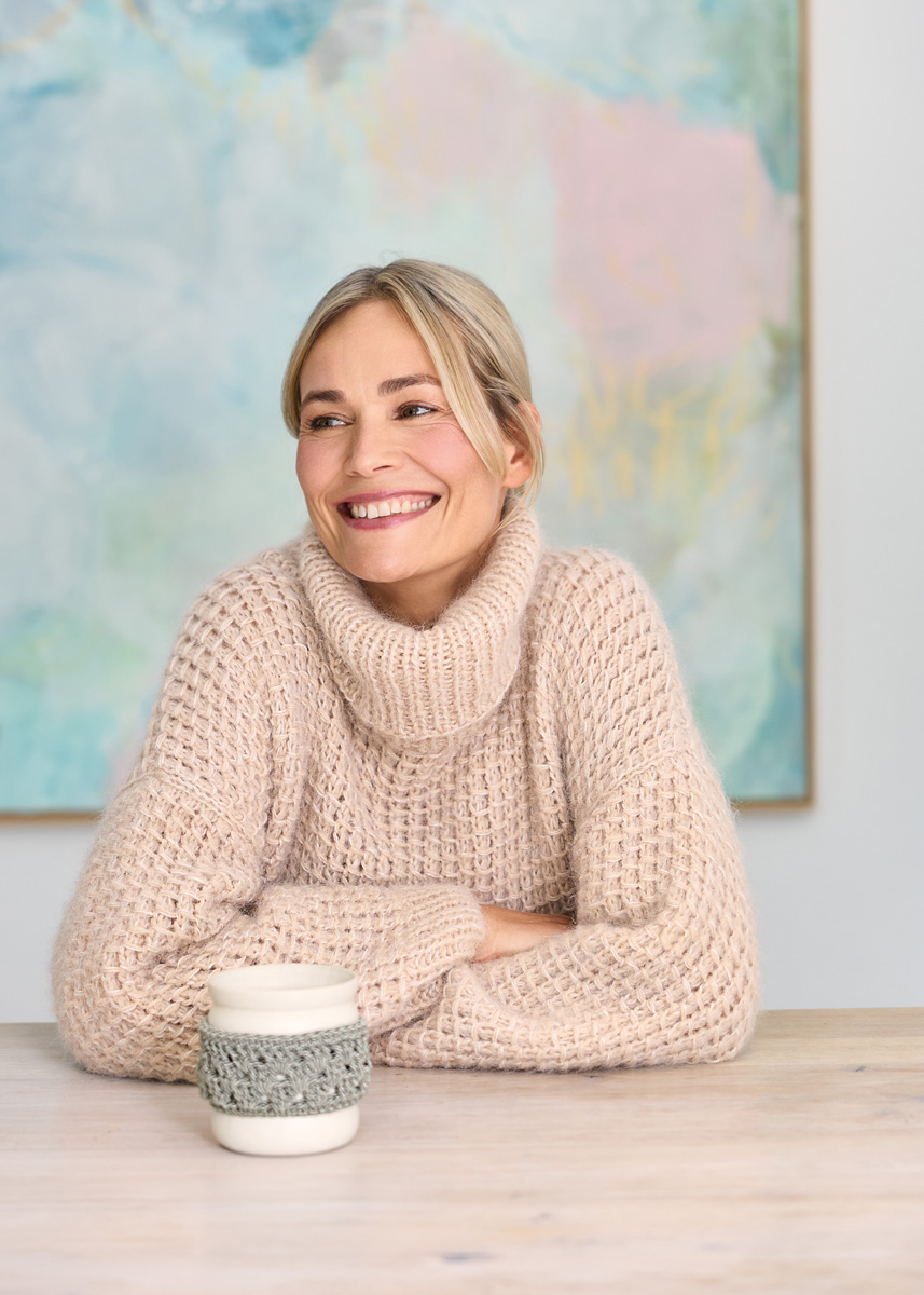 Lana Grossa-Qualität „Nebbia” (55 % Schurwolle (Merino extrafine), 45 % (Baby) Alpaka, LL = ca. 170 m/50 g): ca. 350 (400 – 450) g Beige (Fb. 13) und Lana Grossa- Qualität „Silkhair” (70 % Mohair (Superkid), 30 % Seide, LL = ca. 210 m/25 g): ca. 250 (275 – 300) g Hellbeige (Fb. 18); Stricknadeln Nr. 6,5 und 7, 1 Rundstricknadel Nr. 7, 50 cm lang.